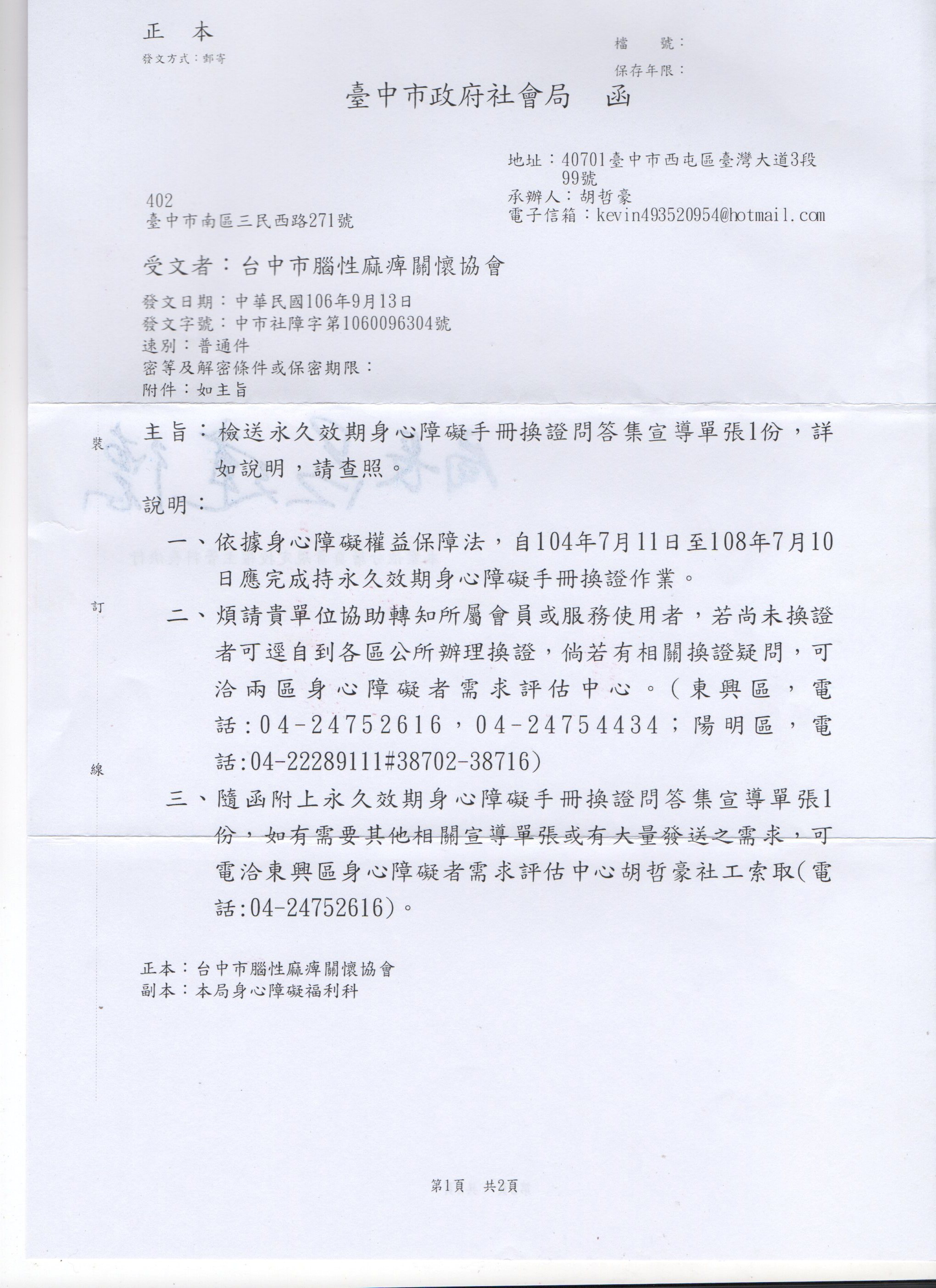 身心障礙福利轉知~永久身心障礙手冊換證宣傳