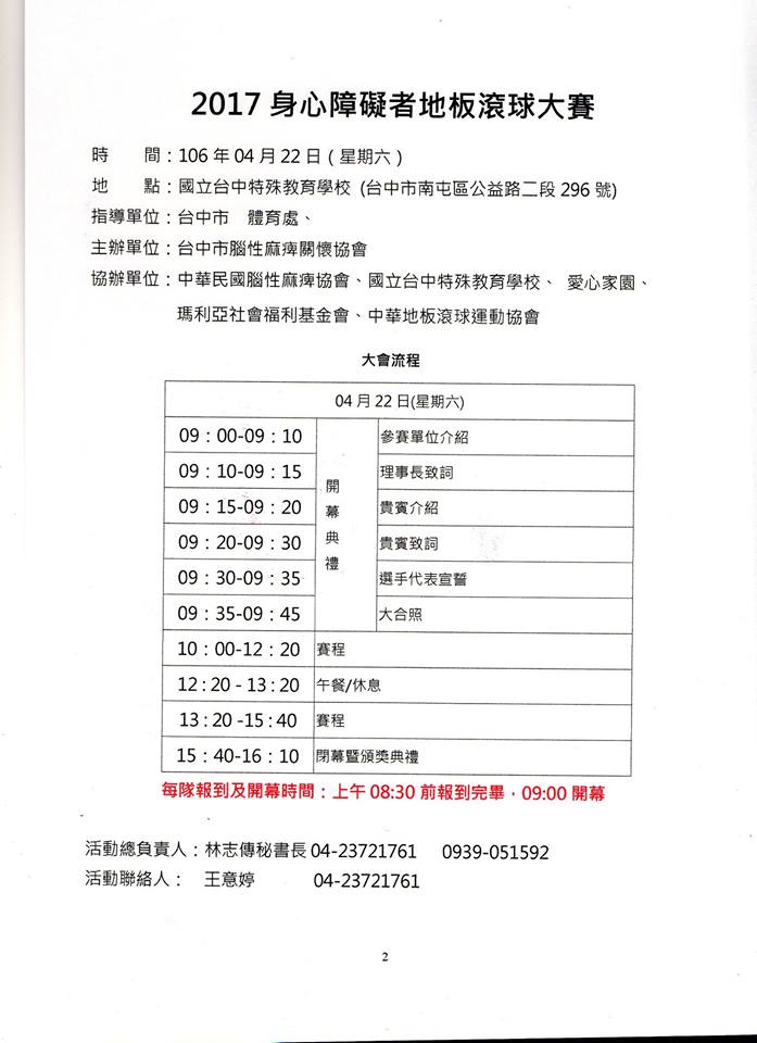 2017身心障礙者地板滾球大賽隊伍選手名單及活動流程表