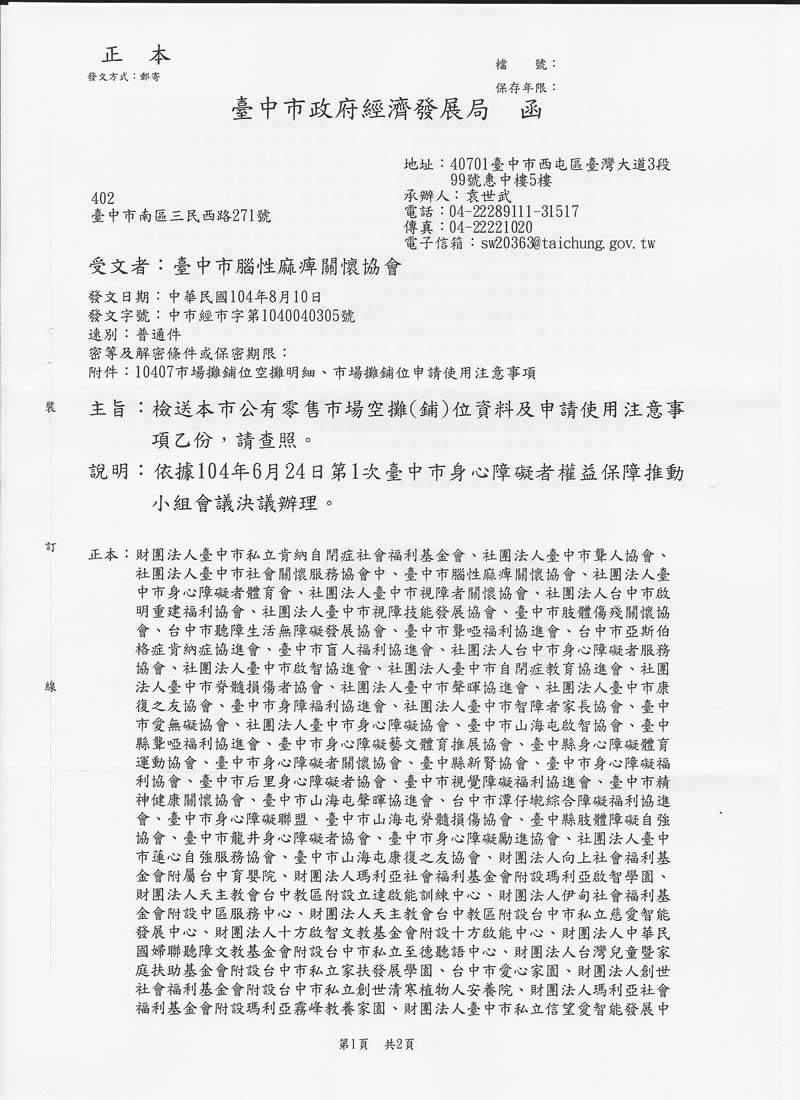 郵局繳費:00213640337209 台中市腦性麻痺關懷協會
