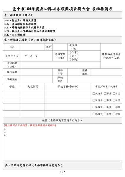 臺中市104年度身心障礙各類獎項表揚大會 表揚推薦表