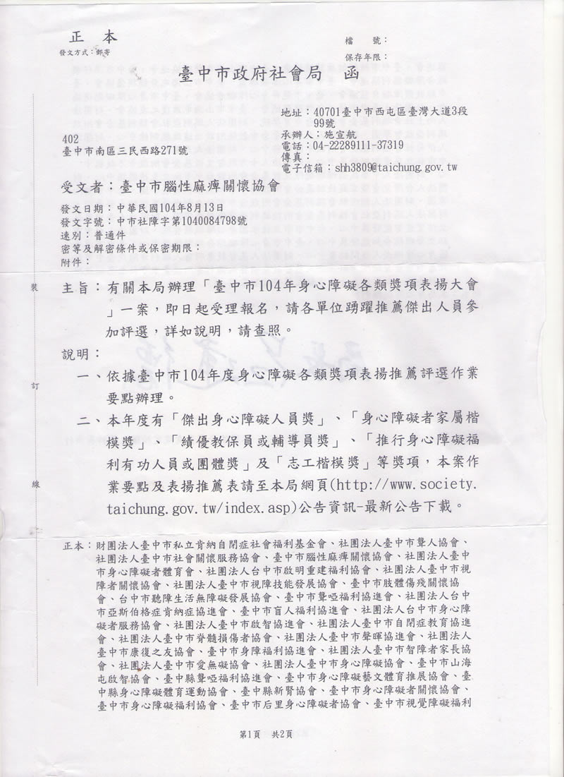 臺中市104年度身心障礙各類獎項表揚推薦評選作業要點