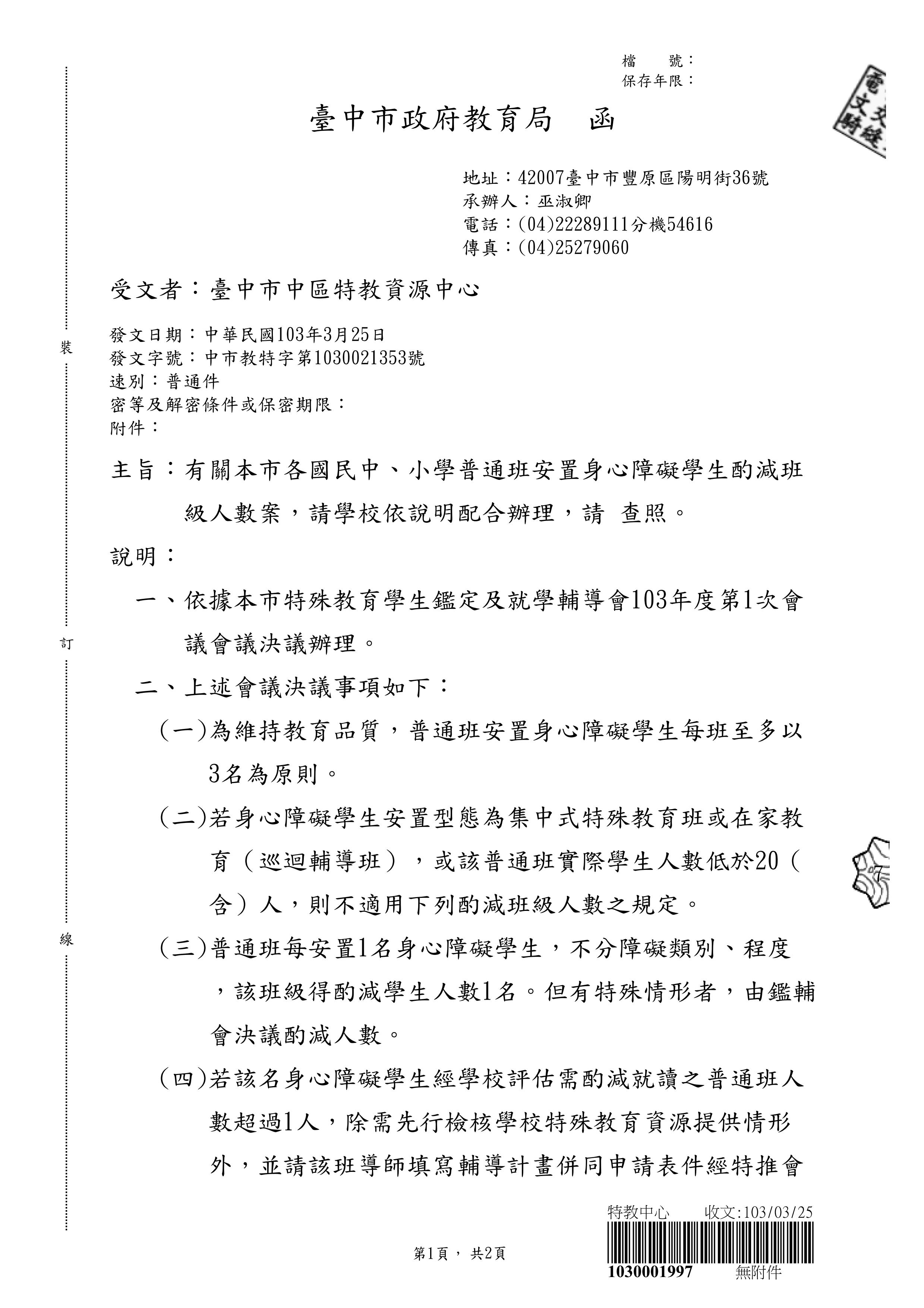 各縣市身心障礙學生就讀普通班酌減班級人數作業原則