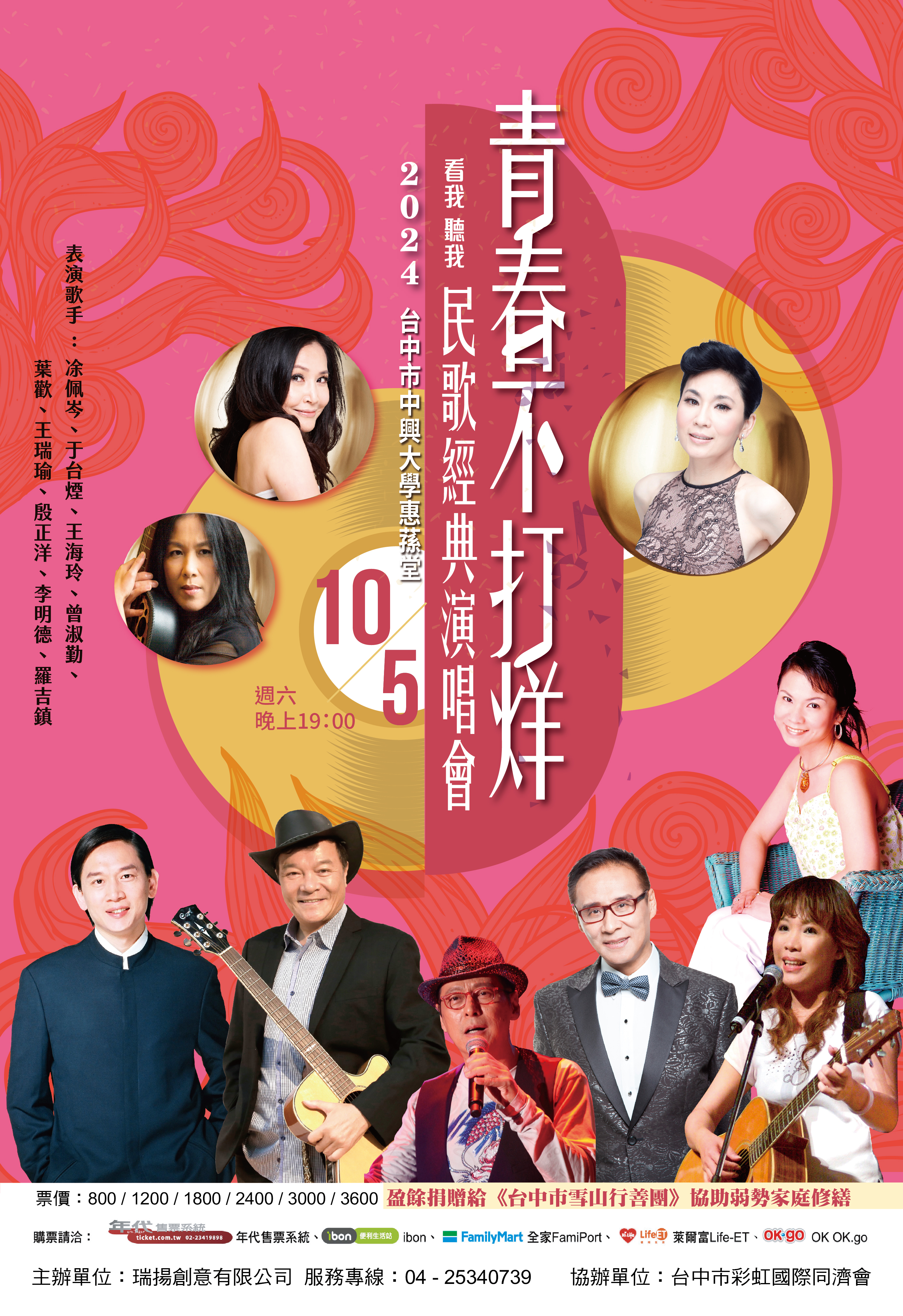 10/5(六)晚上19:00 中興大學惠蓀堂青春不打烊 看我 聽我 民歌經典演唱會,有愛最美社會服務活動