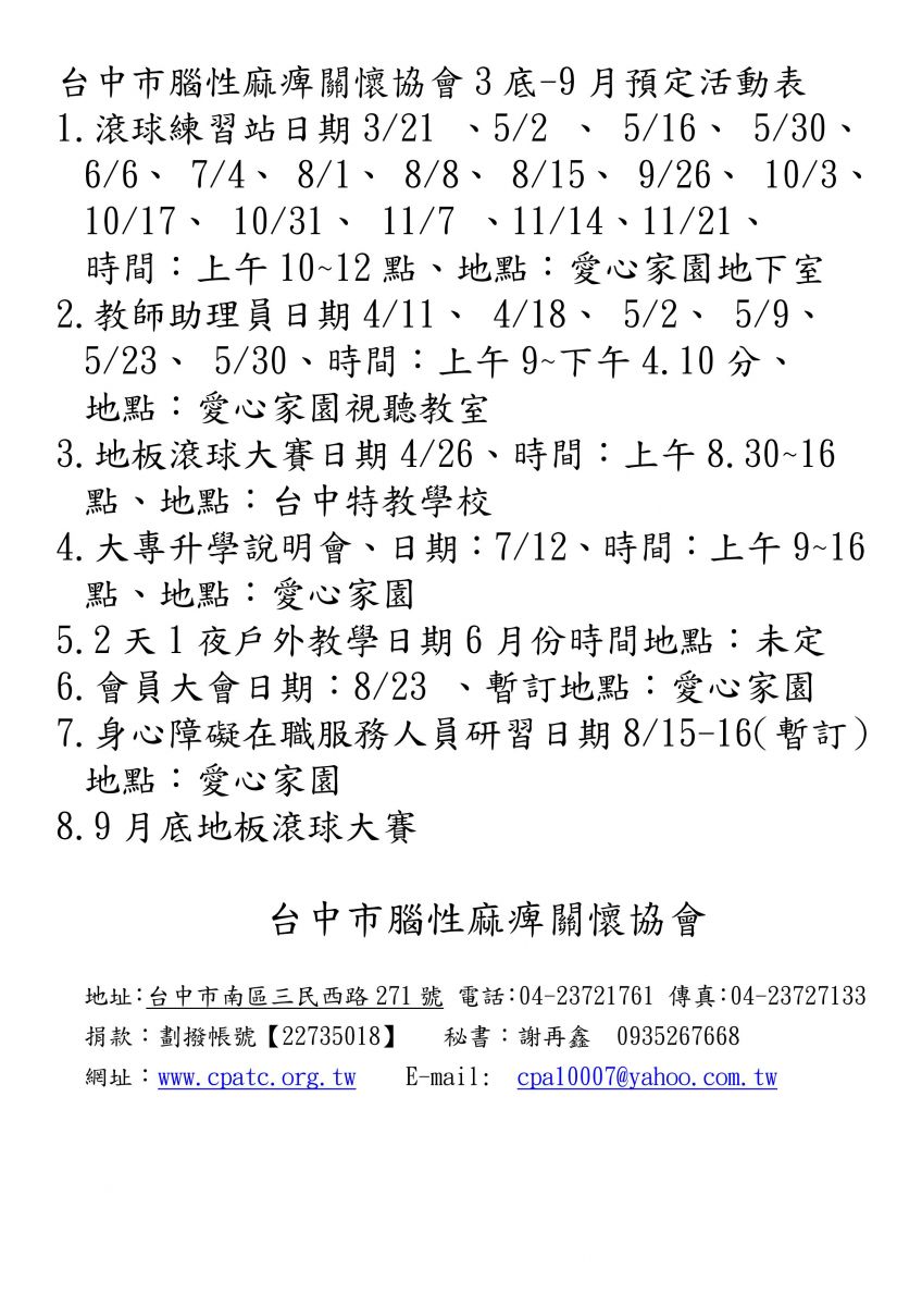 腦性麻痺關懷協會3~9月活動