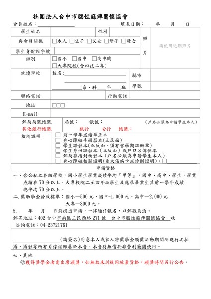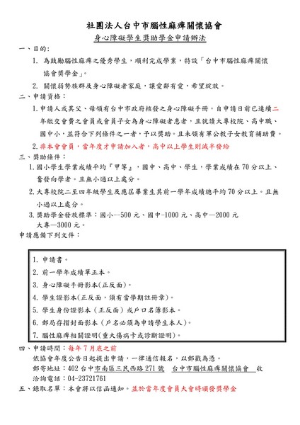 台中市腦性麻痺關懷協會獎助學金申請開始了請符合資格者提出申請