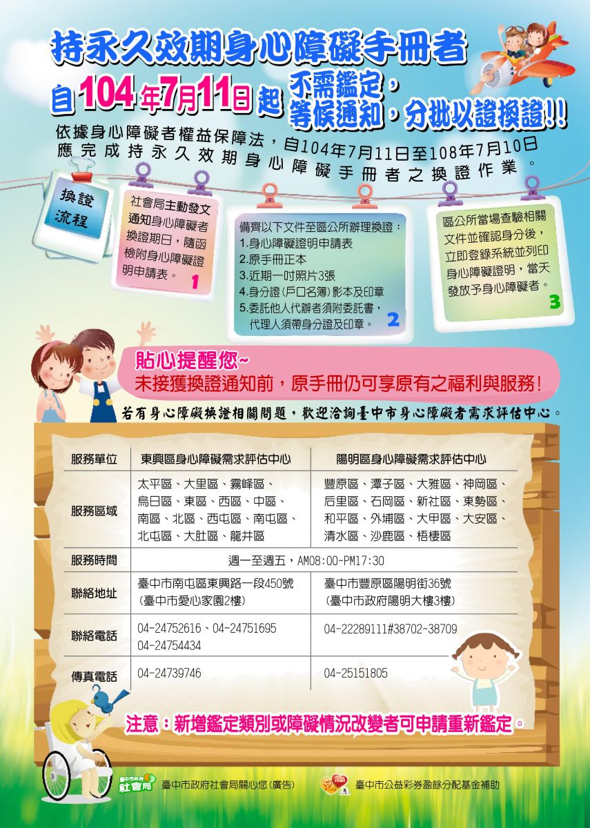 身心障礙者手冊換證開始日期:2015-08-26依據身權法第106條第1項及第5項規定略以,直轄市、縣(市)政府對於持永久效期身心障礙手冊者,於104年7月11日起至108年7月10日止,應完成持永久效期身心障礙手冊者之換證作業。 一、身心障礙證明換發原則 依衛福部社家署規劃之4年5批換證順序作業,本市將分區依年齡排序安排通知換證。 二、換證流程三步驟 (一)等通知: 民眾無需自行洽詢戶籍所在地縣市政府換證時間,社會局會主動發文通知身心障礙者換證期日,並隨函檢附身心障礙證明申請表。 (二)備文件: 1.填妥之身心障礙證明申請表。 2.原永久效期身心障礙手冊正本。 3.最近三個月內一吋照片3張。 4.身分證影本及印章,未滿14歲者得檢附戶口名簿影本。 5.倘申請者本人無法親自前往申請,則可委託法定代理人或他人代為申請,但受委託之法定代理人或他人須檢附委託書、個人身分證與印章。 (三)到公所: 民眾備妥文件後,到區公所提出申請,區公所當場查驗身分及相關文件後,立即登錄系統並印製身心障礙證明,當日發放。 三、注意事項 類別、等級需異動者請先至區公所申請身心障礙鑑定,再持申請表與鑑定表至鑑定醫院進行鑑定,俟衛生局審核後將完成之鑑定表送至社會局,社會局將依鑑定表所註記之類別與等級印製身心障礙證明,並發函請民眾至原申請區公所領取。 貼心提醒您~未接獲換證通知前,原手冊仍可享原有之福利與服務! |