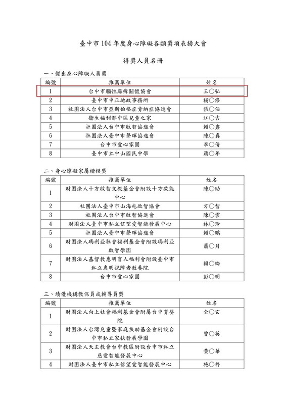 恭喜本會會員王鈞弘榮獲台中市【傑出身心障礙人員獎】11/21將接受市長表揚本會與有榮焉