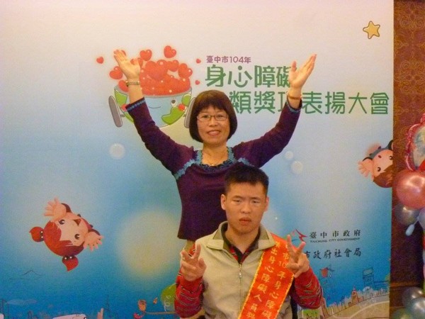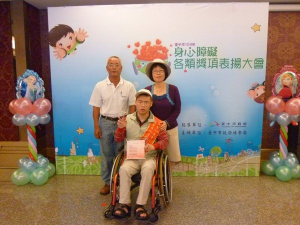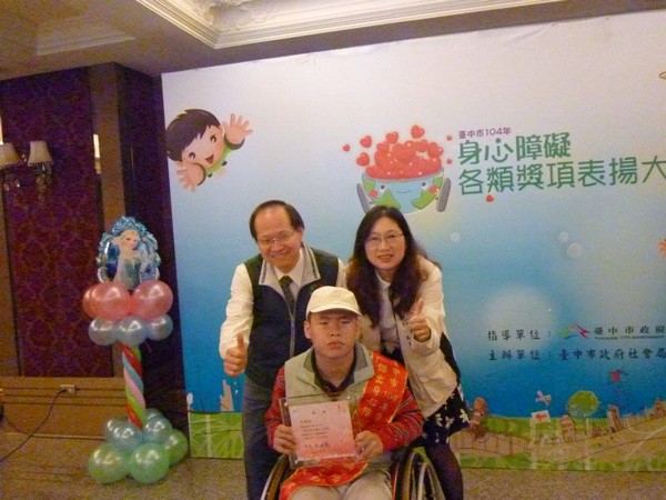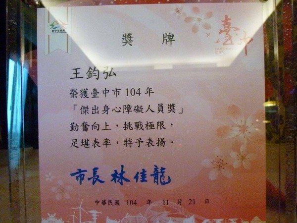 恭喜王鈞弘會員榮獲台中市傑出身心障礙者獎項並參加表揚大會秘書長及鈞弘全家皆參與大會大家都與有榮焉