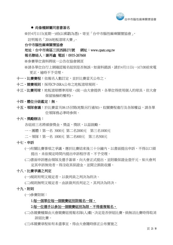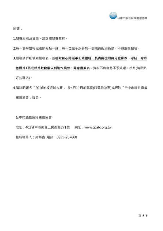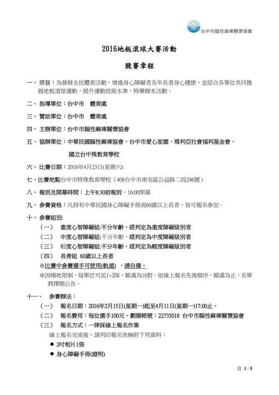 2016地板滾球大賽日期:2016-02-18您已經在 BeClass 完成設置一個活動報名表,該報名表相關資訊如下: ◎活動名稱:2016地板滾球大賽活動 ◎活動日期:2016-04-23 ◎報名網址:http://www.beclass.com/rid=1839eda56c577ac96a3f 報名網址(短網址):http://goo.gl/uDAFN8 ◎報名表格:http://www.beclass.com/showregist.php?regist_id=MTgzOWVkYTU2YzU3N2FjOTZhM2Y6U2hvd0Zvcm0= |