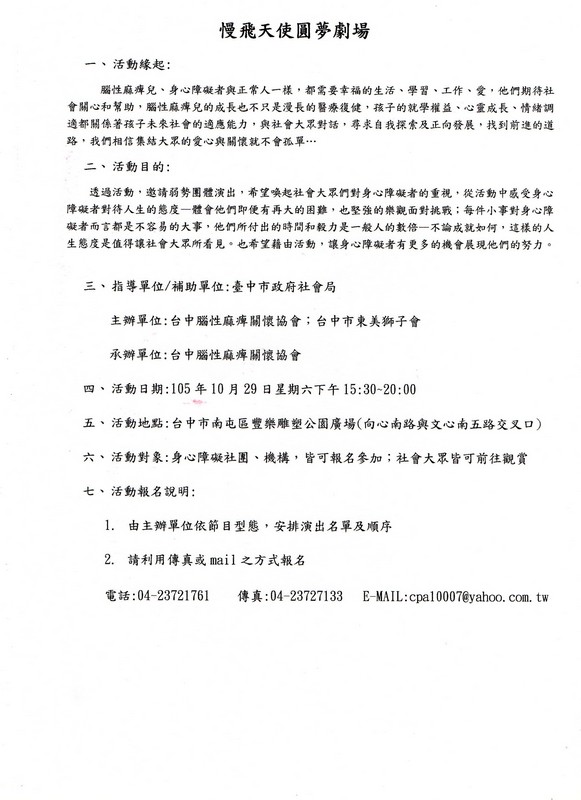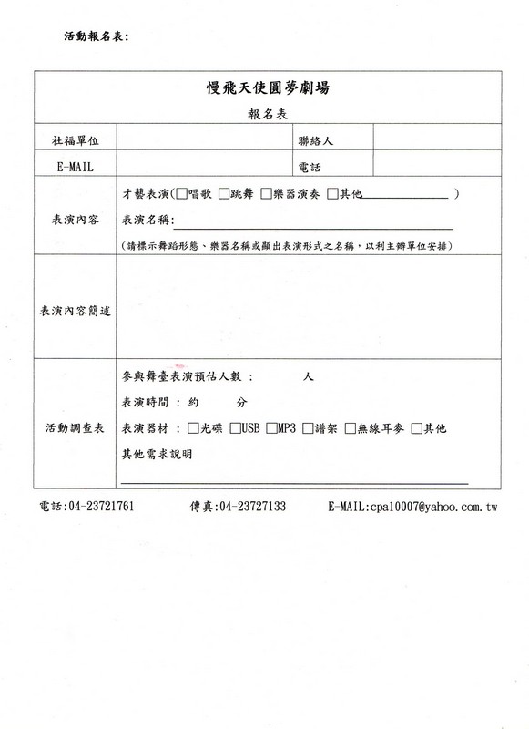 透過活動,邀請弱勢團體演出,希望喚起社會大眾們對身心障礙者的重視,請各社團或機構踴躍報名演出!! 報名專線:04-23721761