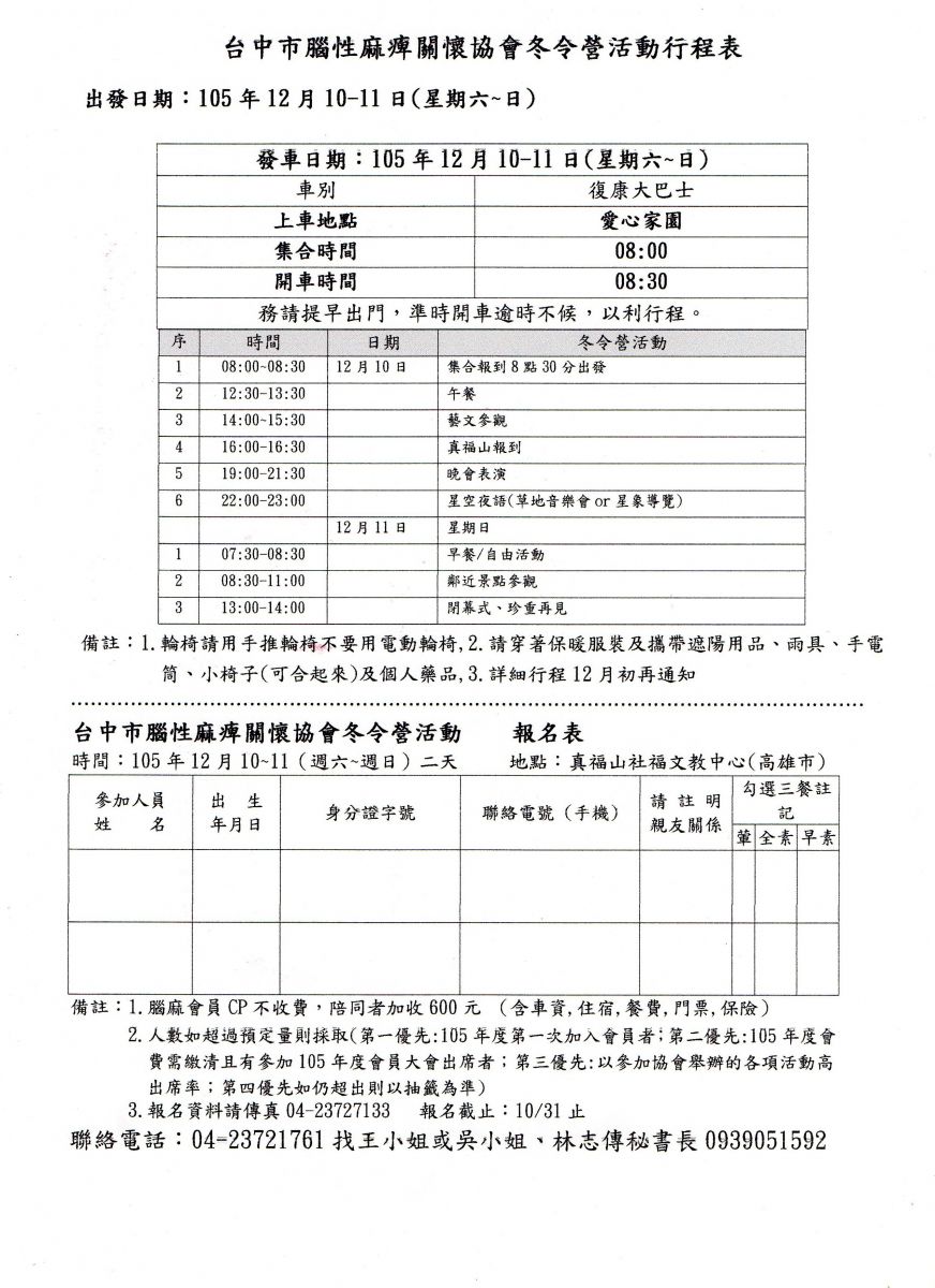 105年台中腦性麻痺冬令營活動日期:2016-10-05報名日期:105/10/5起至105/10/31止,名額有限請盡快報名。 ※備註:人數如超過預定量則採取(第一優先:105年度第一次加入會員者;第二優先:105年度會費需繳清且有參加105年度會員大會出席者;第三優先:以參加協會舉辦的各項活動高出席率;第四優先如仍超出則以抽籤為準) |