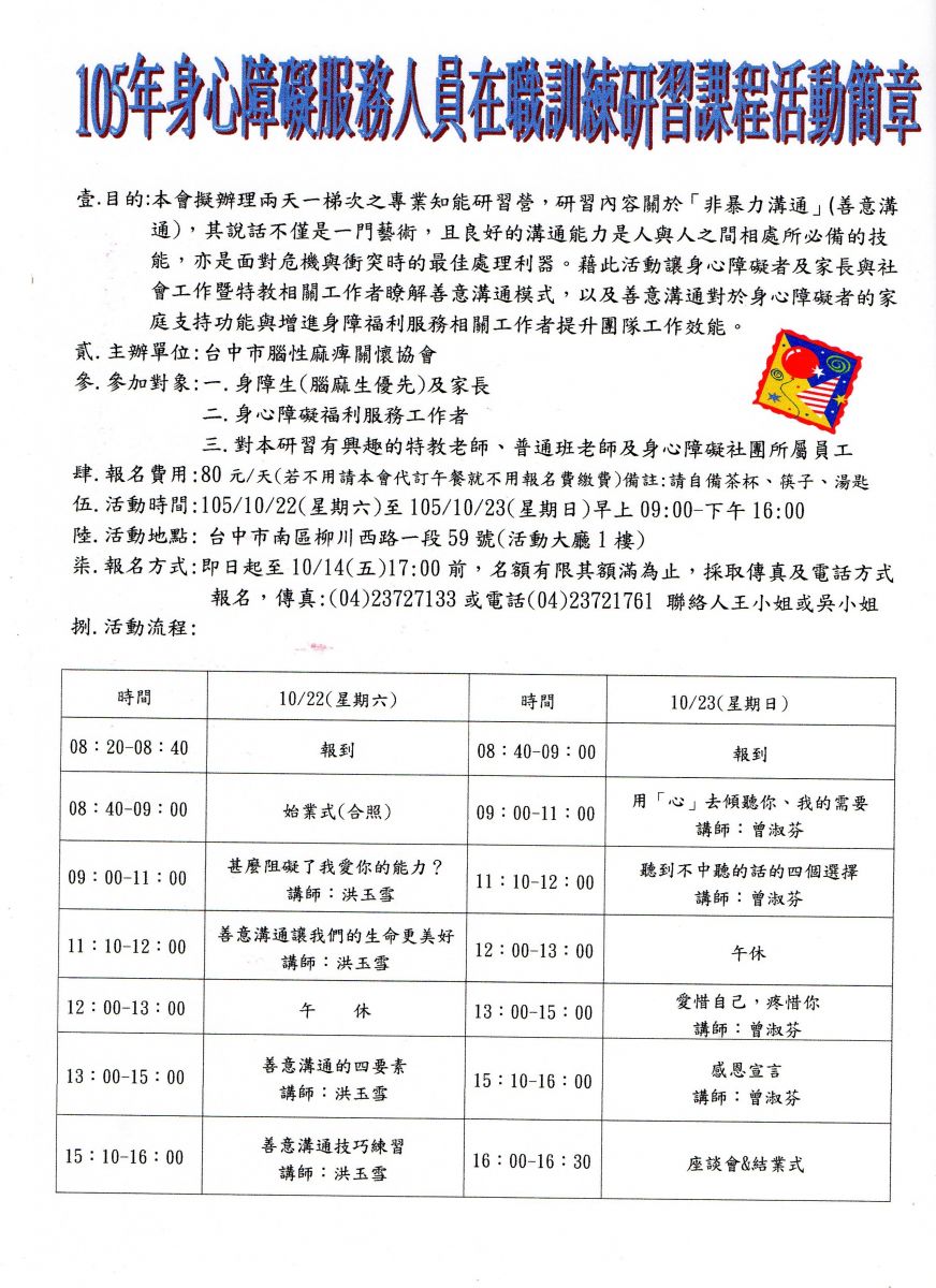 105年身心障礙服務人員在職訓練研習課程活動簡章日期:2016-10-06本會擬辦理兩天一梯次之專業知能研習營,研習內容關於「非暴力溝通」(善意溝通),其說話不僅是一門藝術,且良好的溝通能力是人與人之間相處所必備的技能,亦是面對危機與衝突時的最佳處理利器。藉此活動讓身心障礙者及家長與社會工作暨特教相關工作者瞭解善意溝通模式,以及善意溝通對於身心障礙者的家庭支持功能與增進身障福利服務相關工作者提升團隊工作效能。 |