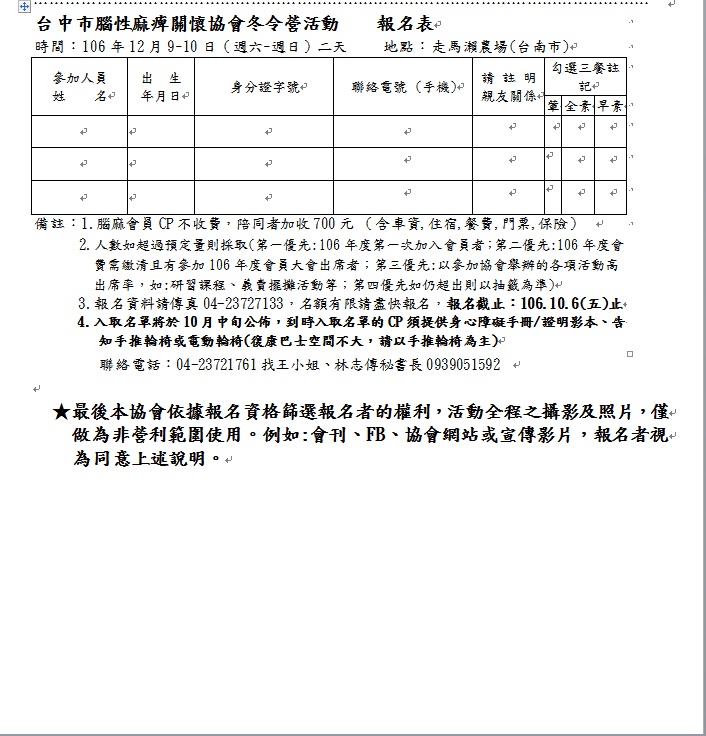 2017年珍愛 惜緣 冬令營報名日期:2017-09-30一.活動宗旨:發揚「WE SEVER」我們服務的獅子精神、服務人群貢獻社會。 活動目的: 1.腦性麻痺患者因肢體的不便,極少有機會走出戶外接近大自然,期望能藉由本次的活動讓腦麻家庭塵封已久的心靈能重啟一扇窗,迎向溫暖的陽光盼望著未來的希望。 2.讓腦麻家庭能接受社會大眾的關懷,讓社會大眾更認識並關心這群需要幫助的朋友。 3.讓腦麻孩子及家庭經由活動的參與彼此交換心得並分享經驗.共同為腦麻孩子而努力,讓腦麻家庭不孤單,勇敢迎向未來的險阻與挑戰。 二.活動日期:106年12月9~10日(星期六~日)2天 活動地點:走馬瀨農場(台南市大內區二溪里唭子瓦60號) |
