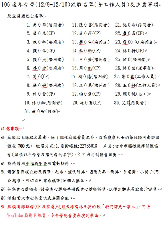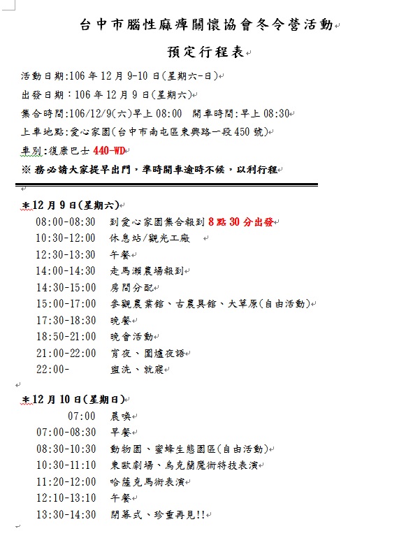 活動告知 :106年冬令營行前通知日期:2017-12-06活動日期:106年12月9-10日(這禮拜六、日) 出發日期:106年12月9日(這禮拜六) 集合時間:106年12月9日 星期六 早上08:00(開車時間:早上08:30) 上車地點:愛心家園(台中市南屯區東興路一段450號) 車別:復康巴士440-WD 務必請大家提早出門,準時開車逾時不候,以利行程。  注意事項: 1.活動那兩天請用手推輪椅不要用電動輪椅。 2.最近日夜溫差大,請穿著保暖衣物及攜帶毛巾、盥洗用 具、遮陽用品、雨具、、手電筒、小椅子(可合起來,可依 個人需求攜帶)及個人藥品等。 3.若為身心障礙者,請攜帶身心障礙手冊或身心障礙證 明,以便到觀光景點出示證明。 4.活動當天會公佈桌次及房間分配。 5.麻煩有錄取者(CP及家屬)近幾天練唱林玉英的歌「我 們都是一家人」,可去 YouTube找影片練習,冬令營晚 會要表演的歌曲。 |