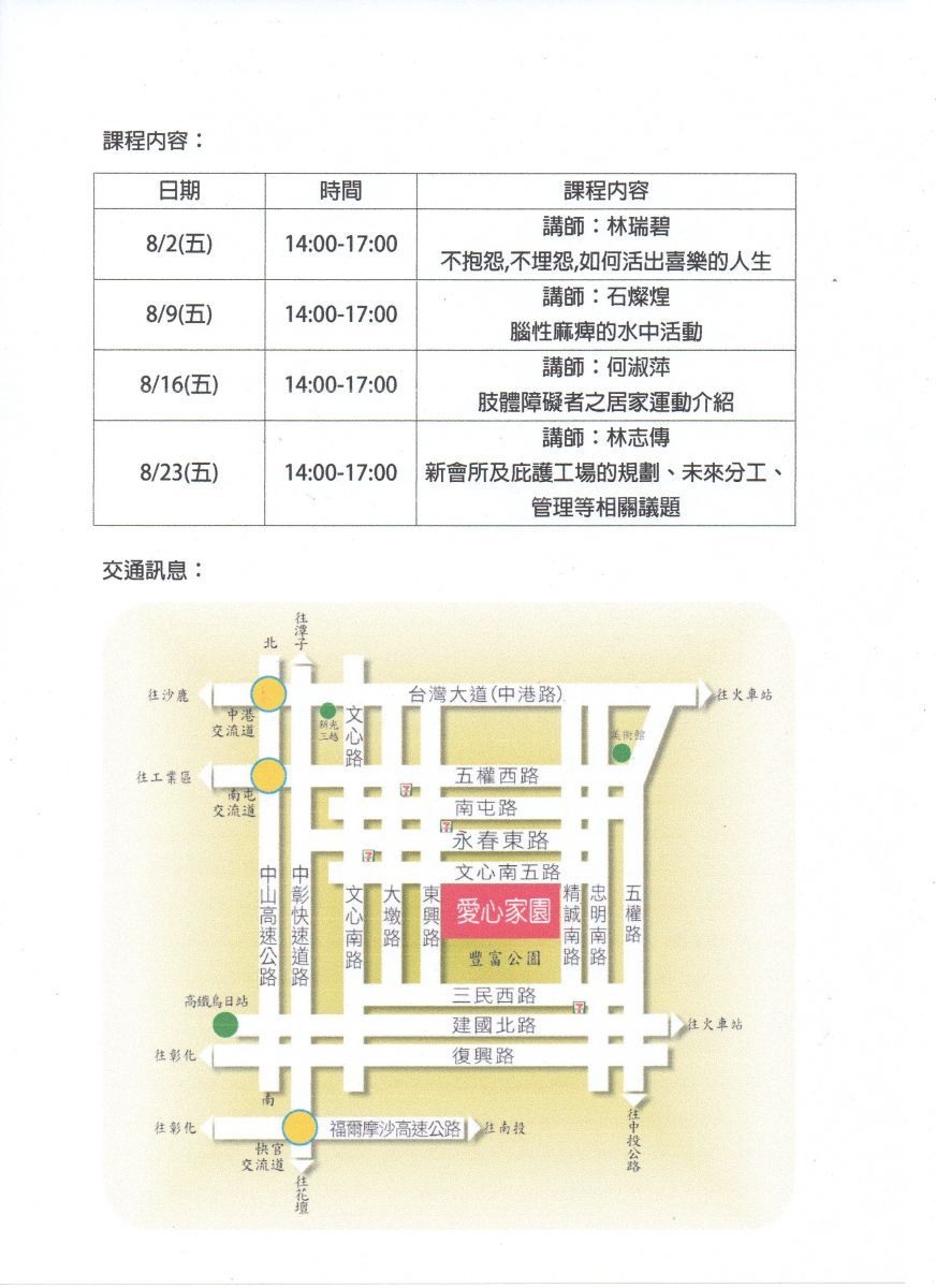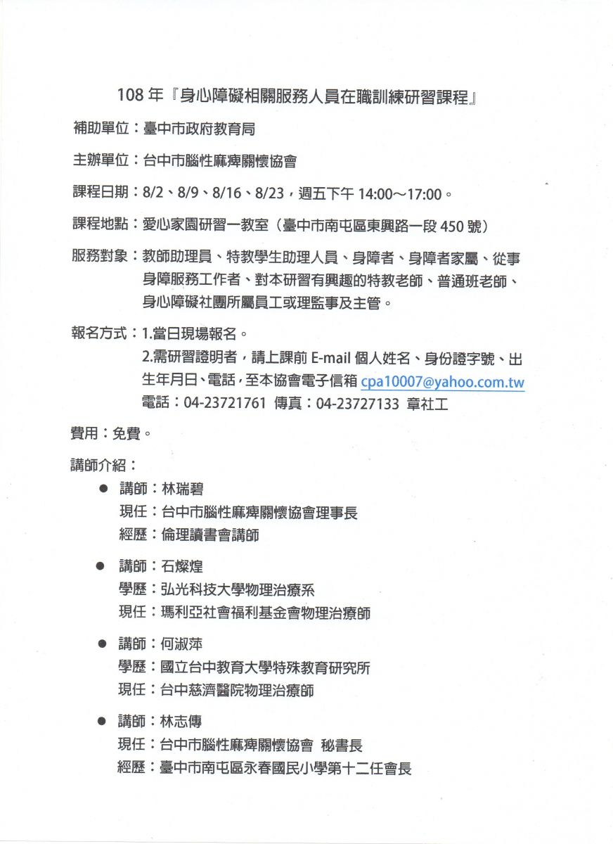 108年『身心障礙相關服務人員在職訓練研習課程』 補助單位:臺中市政府教育局 主辦單位:台中市腦性麻痺關懷協會 課程日期:8/2、8/9、8/16、8/23,週五下午14:00~17:00。 課程地點:愛心家園研習一教室(臺中市南屯區東興路一段450號) 服務對象: 教師助理員、特教學生助理人員、身障者、身障者家屬、從事身障服務工作者、對本研習有興趣的特教老師、普通班老師、身心障礙社團所屬員工或理監事及主管。 報名方式: 1.當日現場報名。 2.需研習證明者,請上課前E-mail個人姓名、身份證字號、出生年月日、電話,至本協會電子信箱cpa10007@yahoo.com.tw 電話:04-23721761 傳真:04-23727133 章社工 費用:免費。 講師介紹: 講師:林瑞碧 現任:台中市腦性麻痺關懷協會理事長 經歷:倫理讀書會講師 講師:石燦煌 學歷:弘光科技大學物理治療系 現任:瑪利亞社會福利基金會物理治療師 講師:何淑萍 學歷:國立台中教育大學特殊教育研究所 現任:台中慈濟醫院物理治療師 講師:林志傳 現任:台中市腦性麻痺關懷協會 秘書長 經歷:臺中市南屯區永春國民小學第十二任會長