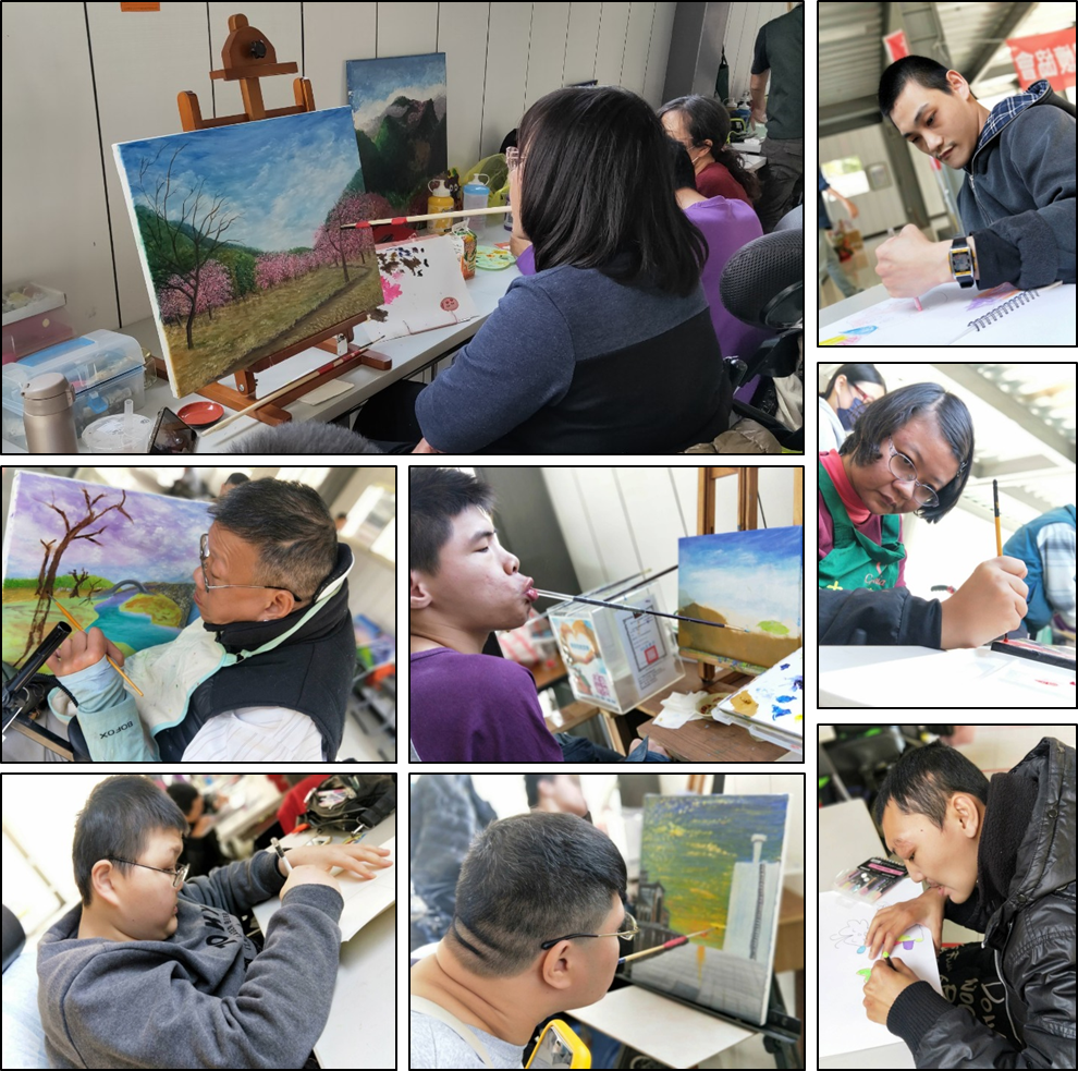 每週一下午兩點至五點,在台中腦麻CP-HOME有藝術創作課程, 由同樣是身障者的周玉茹老師帶領並教導其他身障者繪畫,而教導 他們繪畫一方面是培養他們的興趣,且增加他們的專長,另一方面 是幫他們在考取街頭藝人執照的方面打基礎,更可以透過買賣畫作 來賺取生活費,也就是我們一直以來推廣的讓身障者們自立生活!