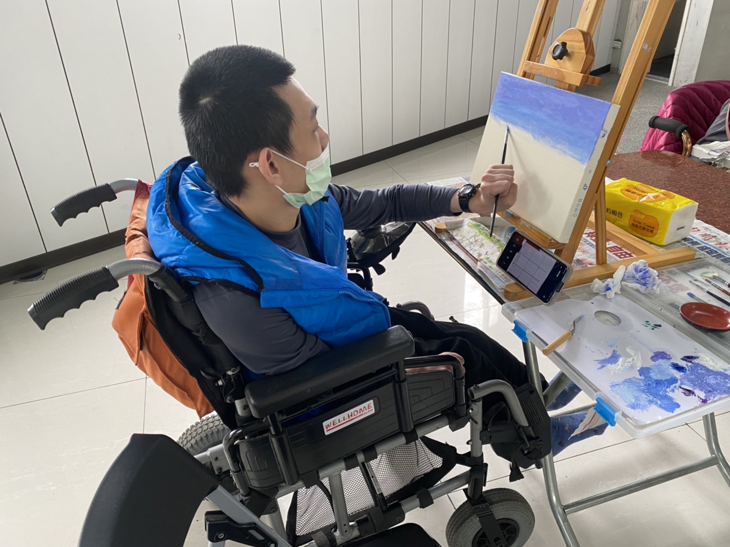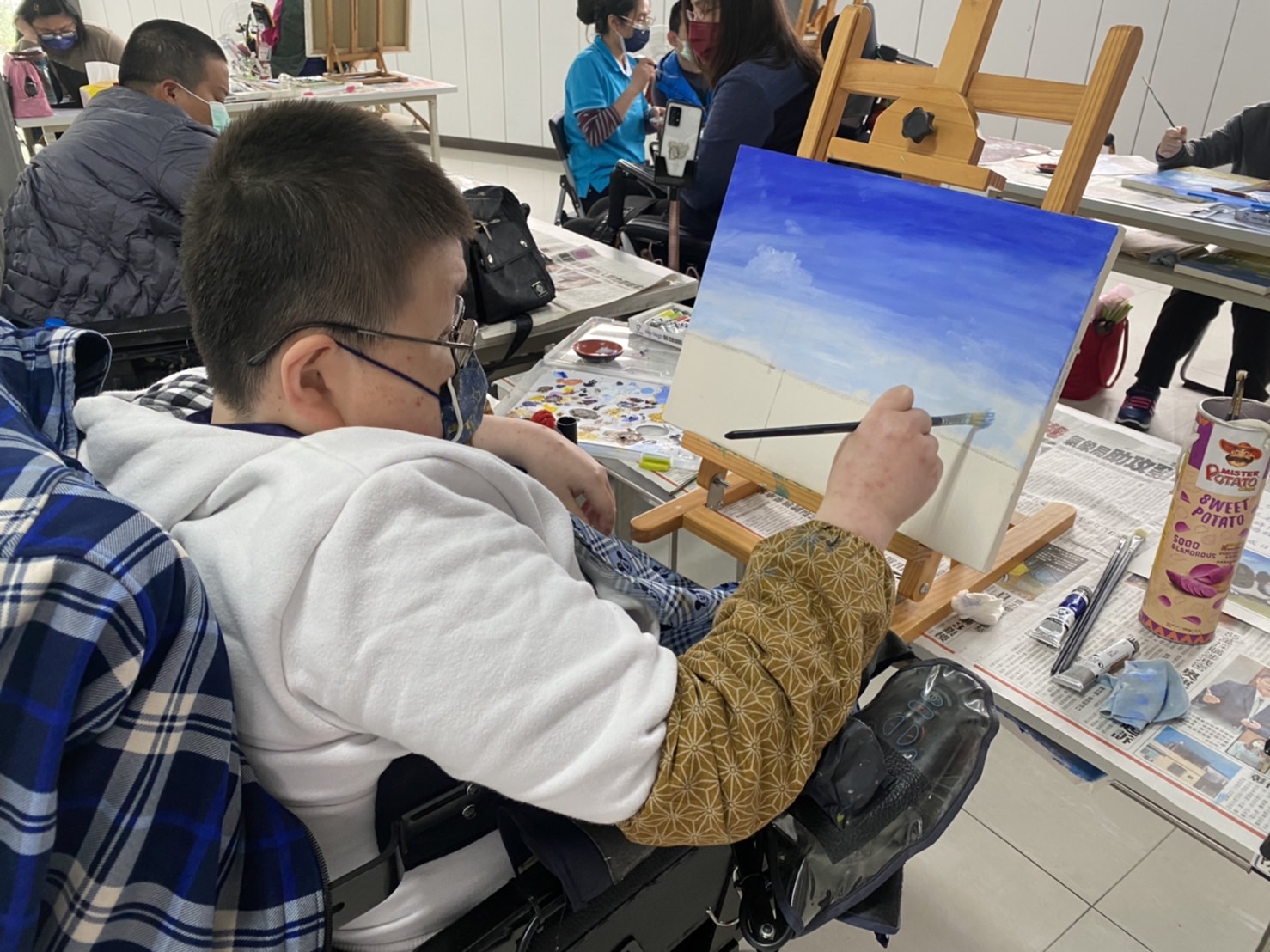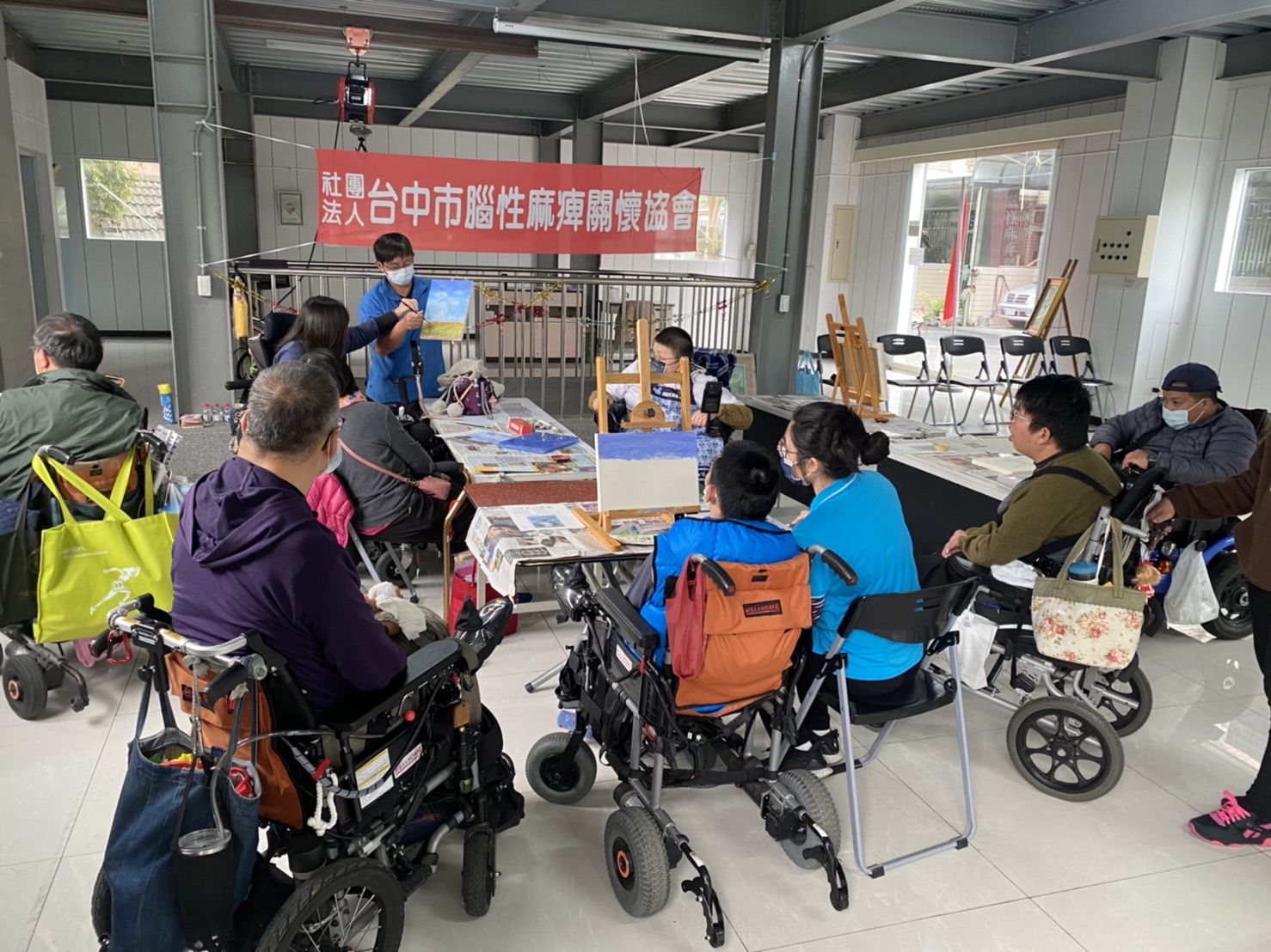 在台中腦麻CP-HOME有藝術繪畫創作課程,由同樣是身 障者的周玉茹老師帶領並教導其他身障者繪畫。 希望透過繪畫創作課程幫助孩子們培養他們第2專長,藉由 藝術媒材的幫助之下,透由一張張圖畫,進而表達自己內心的 想法讓孩子們看到自己存在愛的價值,天賦得以被發掘,使他 們自立生活同時創造更多價值感。 另一方面是幫他們在考取街頭藝人執照的方面打基礎,更可 以透過買賣畫作來賺取生活費,也就是我們一直以來推廣的讓 身障者們自立生活!