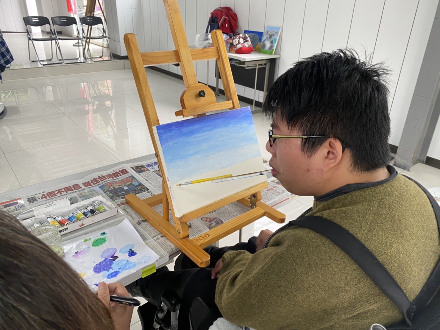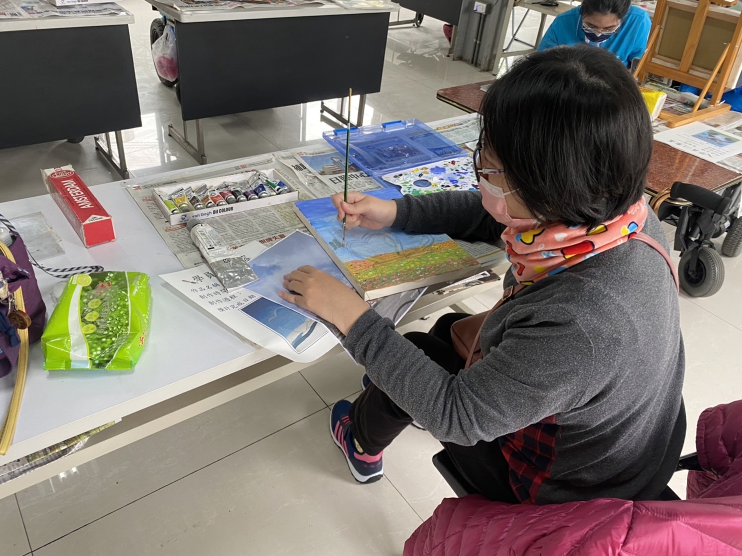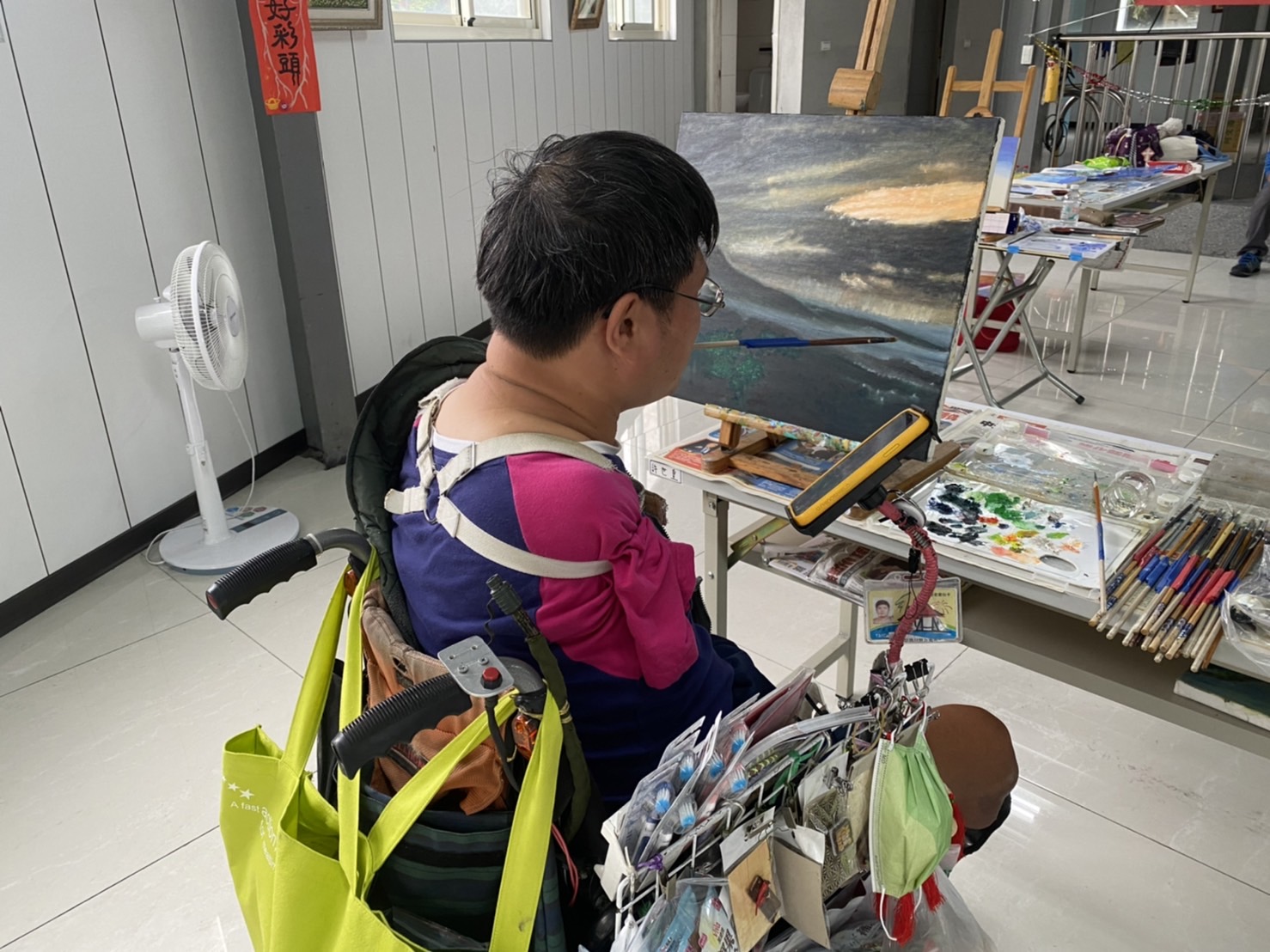 在台中腦麻CP-HOME有藝術繪畫創作課程,由同樣是身 障者的周玉茹老師帶領並教導其他身障者繪畫。 希望透過繪畫創作課程幫助孩子們培養他們第2專長,藉由 藝術媒材的幫助之下,透由一張張圖畫,進而表達自己內心的 想法讓孩子們看到自己存在愛的價值,天賦得以被發掘,使他 們自立生活同時創造更多價值感。 另一方面是幫他們在考取街頭藝人執照的方面打基礎,更可 以透過買賣畫作來賺取生活費,也就是我們一直以來推廣的讓 身障者們自立生活!