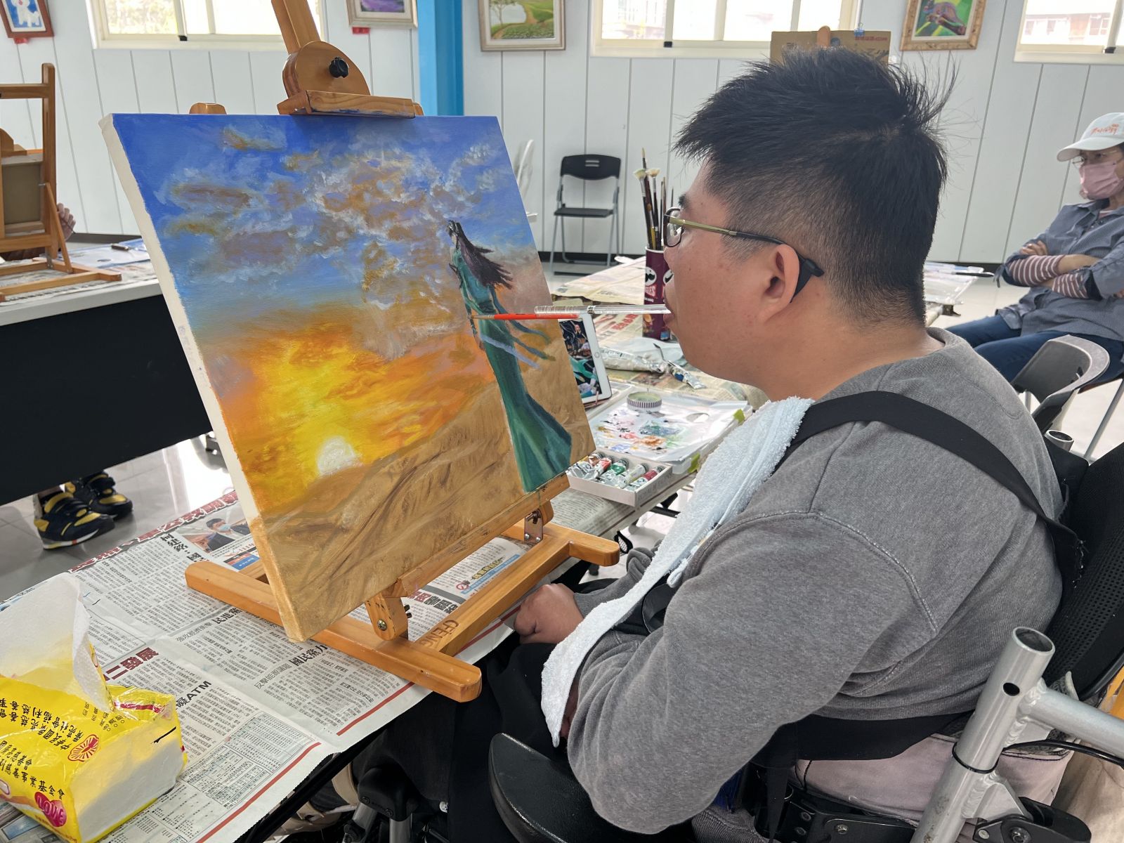 主,在協會學畫時,看著口中咬著的畫筆沾染著顏料