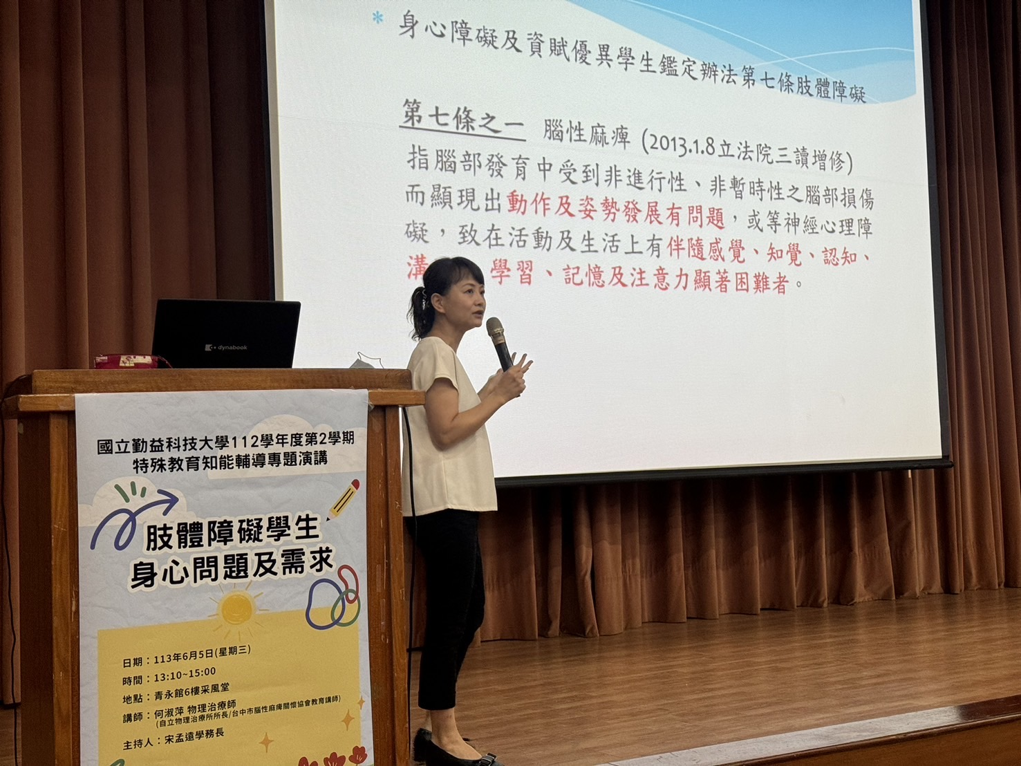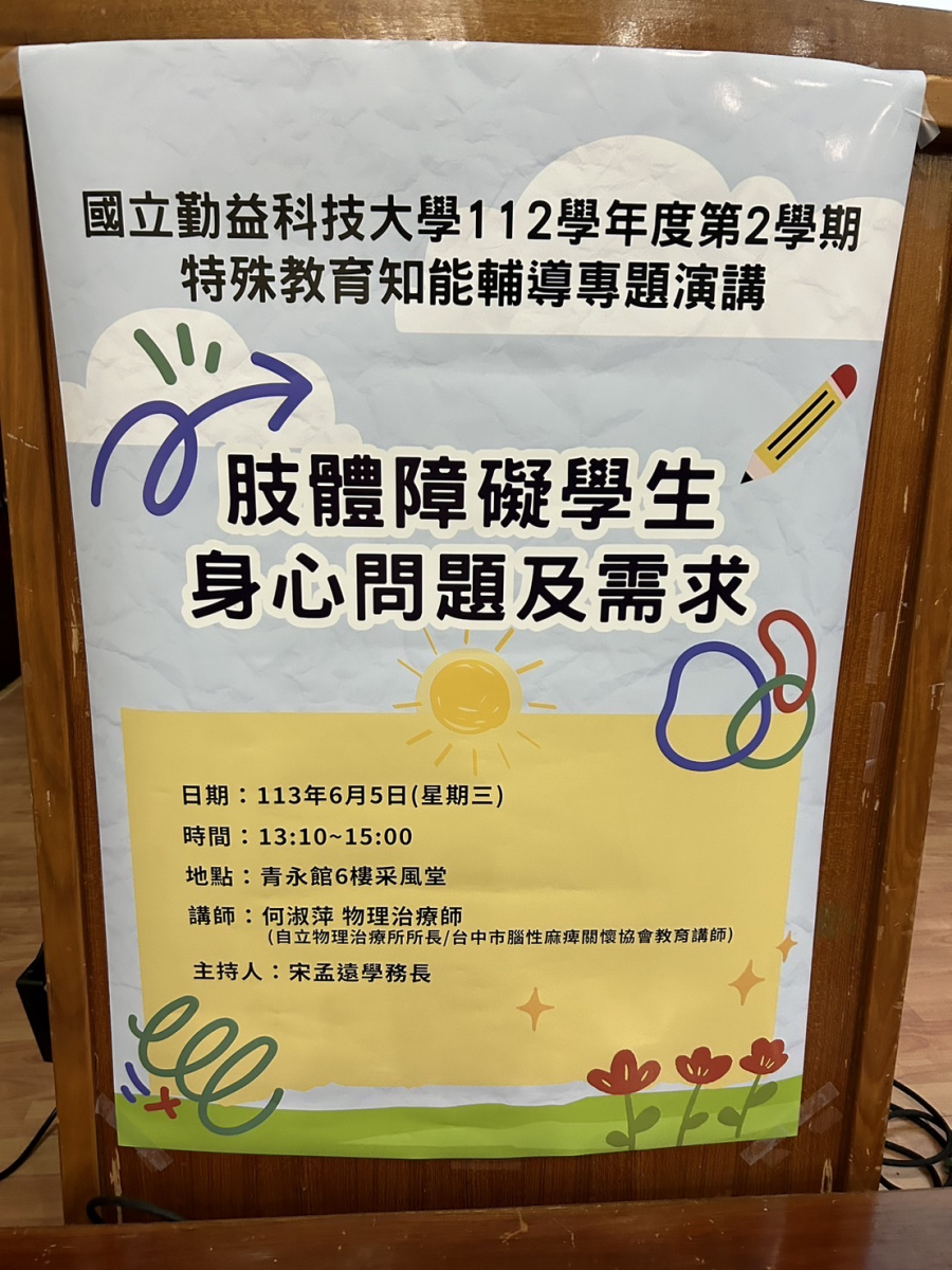 112年第二學年度特殊教育知能輔導專題演講日期:2024-06-11本協會何淑萍物理治療師,至國立勤益科技大學專題演講,演講肢體障礙學生身問題及需求。 |
