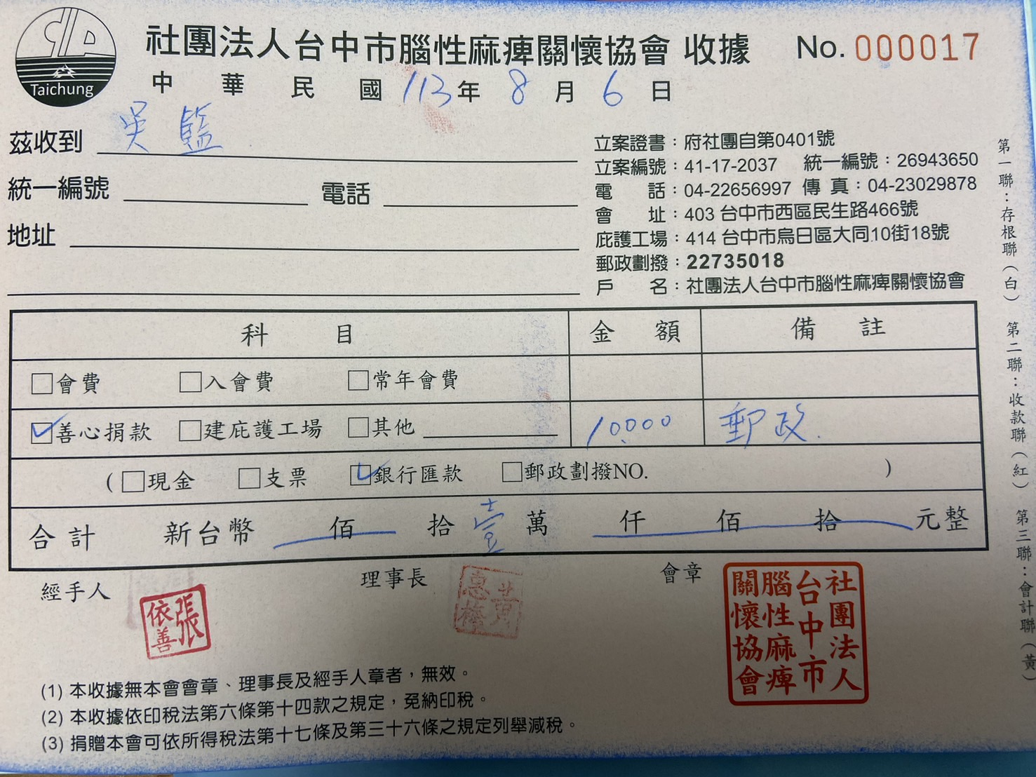 祝福您和您的家人健康快樂,萬事如意。 再次感謝您的慷慨捐助和對台中市腦性麻痺關懷協會的支持。
