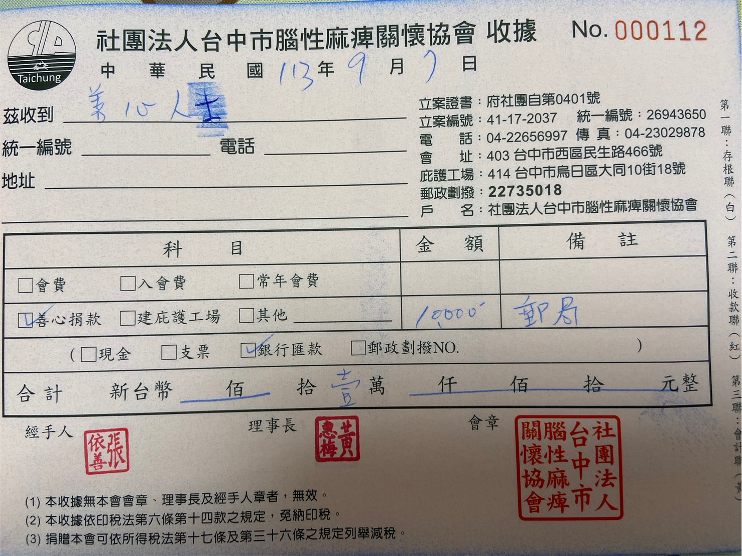 祝福您和您的家人健康快樂,萬事如意。 再次感謝您的慷慨捐助和對台中市腦性麻痺關懷協會的支持。