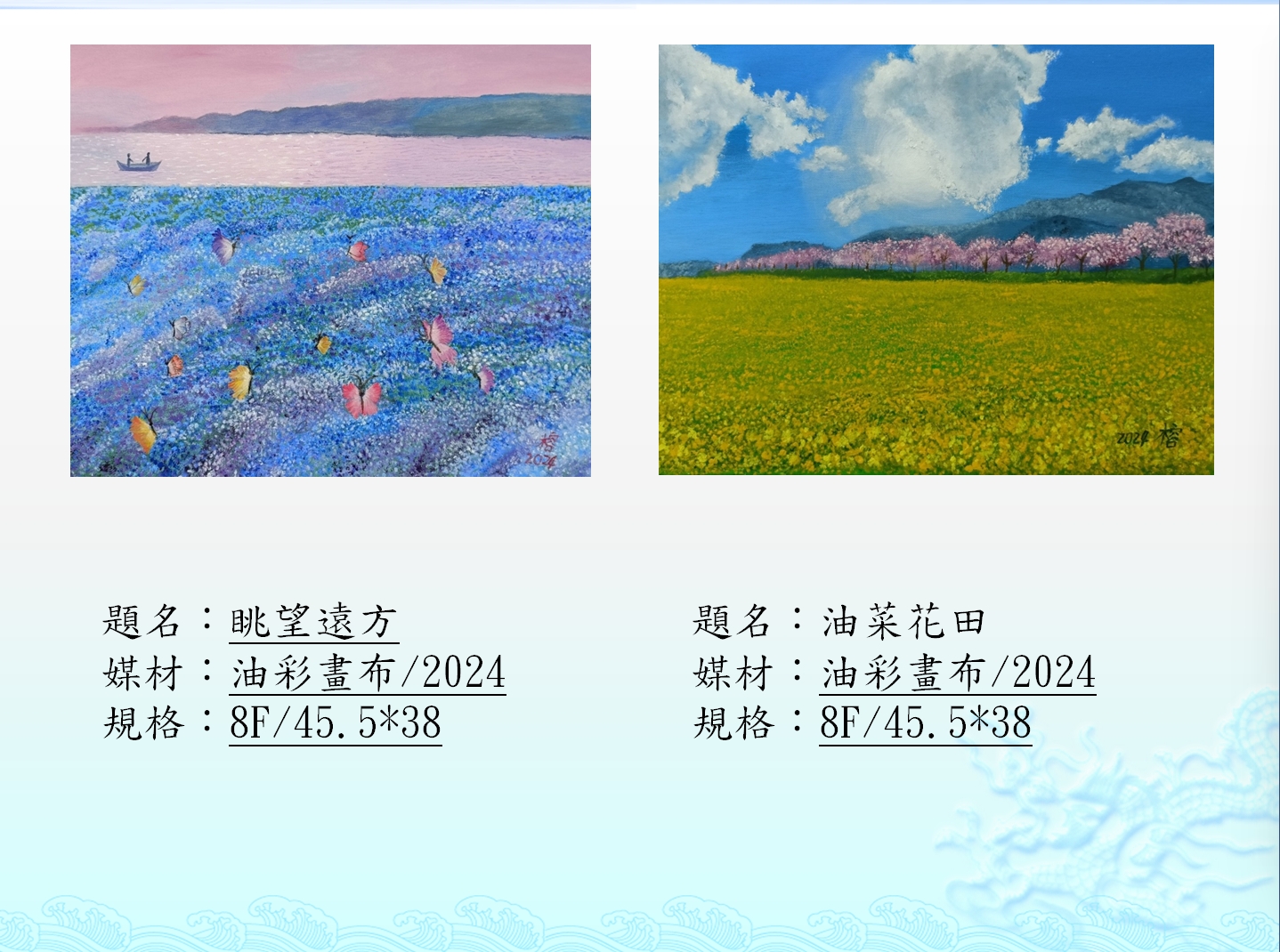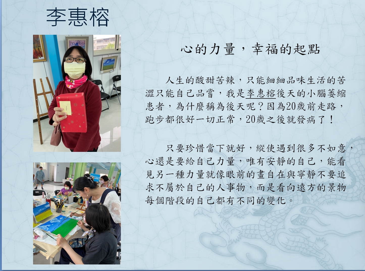 惠榕,是一位動作緩慢、說話輕柔的女孩。走路時腳步不穩,說話總是慢上幾拍,也因為害羞,常常靜靜地坐在角落。然而,她的世界並不 安靜──在她心中,有一片色彩斑斕的花園, 悄悄綻放著她的想法與感受。她不擅長喧嘩,卻用畫筆、用手作、用創作,靜靜說出心底的聲音。 她的作品細膩柔和,像是春天裡的一縷微風,帶著溫度與希望。雖然她的腳步比別人慢,反而讓她有更多時間觀察、感受,並以細膩的心描繪出 專屬她的世界。