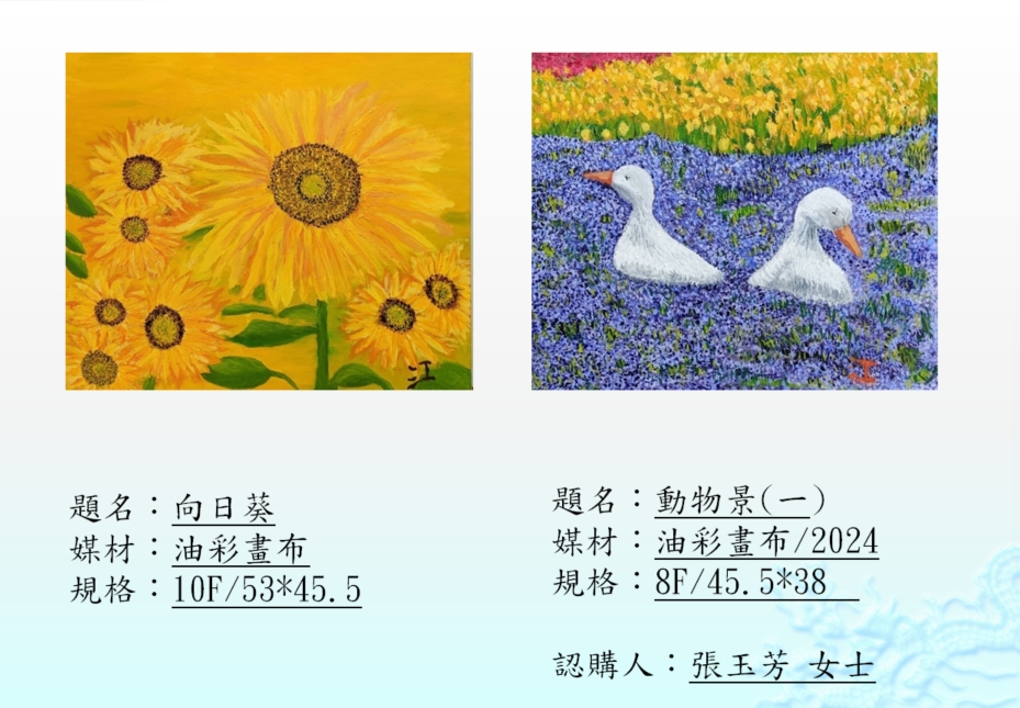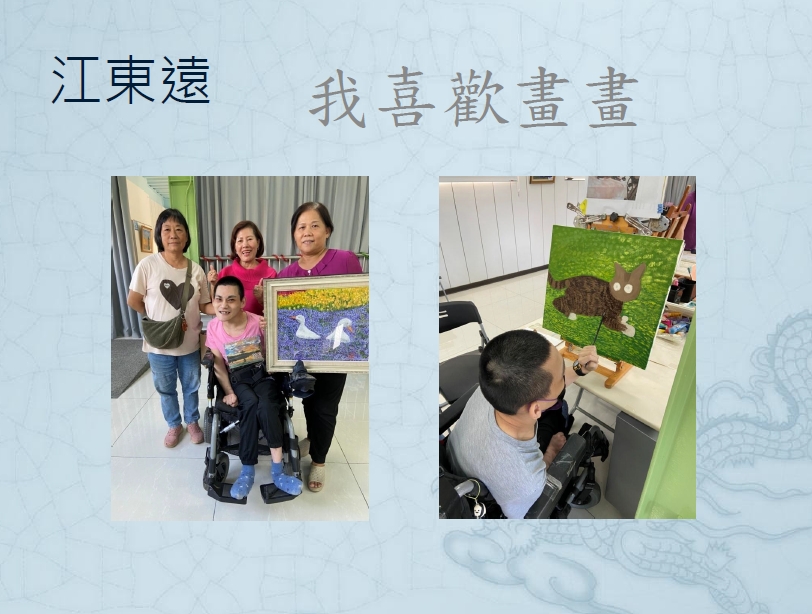 江東遠 JIANG TUNG-YUAN 作品欣賞日期:2025-03-27用畫筆飛翔的腦麻寶寶創作特色,用顫動的手練習穩定、用畫筆說出心裡話,色彩天真直率,單純而真摯,觸動人心。 |