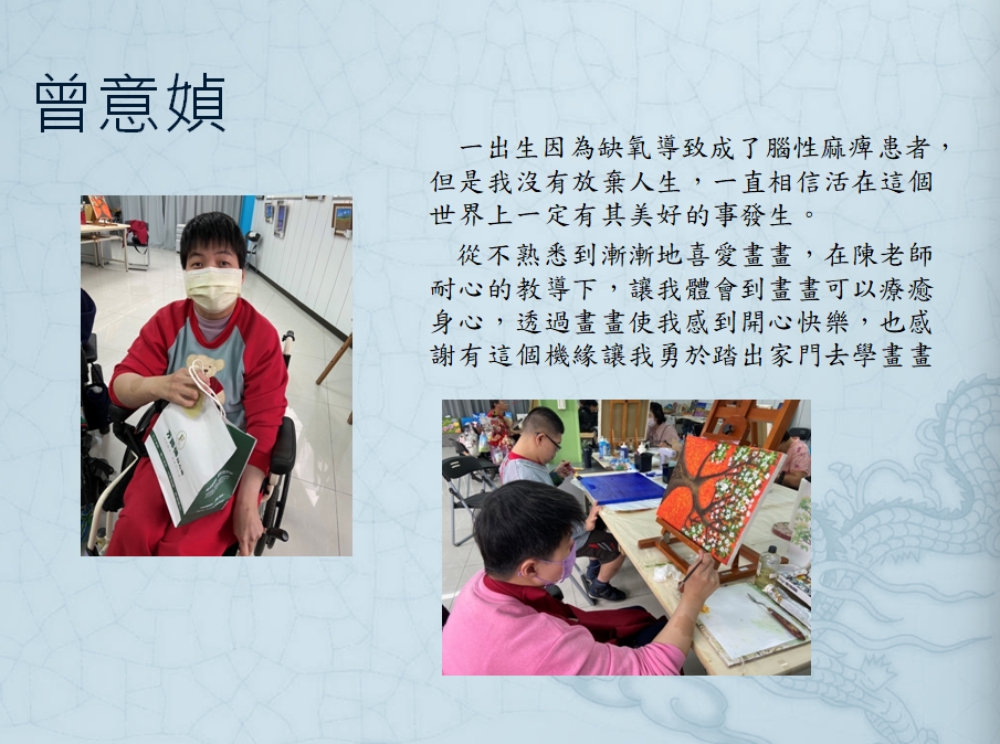 意媜,一位因出生時缺氧導致腦性麻痺的創作者,雖然身體行動受限,卻始終不放棄追尋生活中的亮光。她相信,活在這個世界上,就一定 有值得微笑與期待的事情。從對畫畫一無所知,到逐漸愛上創作,是陳老師的耐心指導與陪伴,讓她踏出了人生重要的一步。 畫畫,不僅讓她 找到表達自己的方式,也帶來療癒與快樂的力量。在這本畫冊中,每一幅作品都承載 著她的努力與希望,也傳遞著單純、真誠的生命溫度。希 望你也能從中感受到那份悄悄綻放的美好。