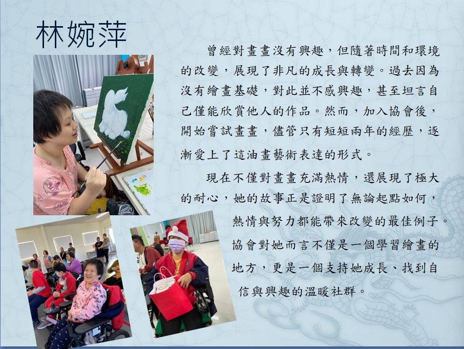 林婉萍 WAN-PING LIN 作品欣賞日期:2025-03-28電動輪椅駕駛小妹,笑著走出自己的路,腦麻讓她行動受限,卻也讓她擁有觀察世界的溫柔眼光個性開朗、愛笑,有點慢、有點可愛,她用笑容、畫筆和輪椅,開出屬於自己的人生路線。 |