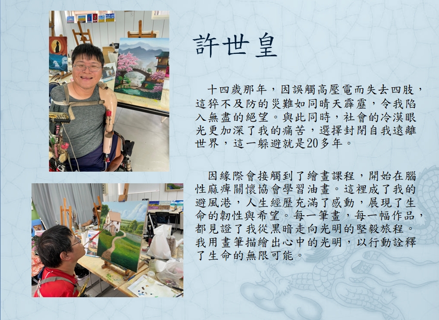 世皇,14歲那年因誤觸高壓電,瞬間失去了四肢,人生從此完全改變。 但他沒有被命運打倒,反而以驚人的意志力,走出一條與眾不同的 生命之路。沒有了四肢,他就用「口」咬筆、用「腳肢殘留的力量」學會創作。從最初的艱難練習,到如今成為一位堅強的口足畫家,他的每一 筆、每一幅畫,都是與命運搏鬥後寫下的堅持與榮耀。 他,是不折不扣的生命戰士。 我的畫筆,不長在手上,而長在靈魂裡。別人一步走完的事,我要用十倍時間,但我一樣能完成。 每一筆畫,都是我和命運說:我還在,而且我做到了。