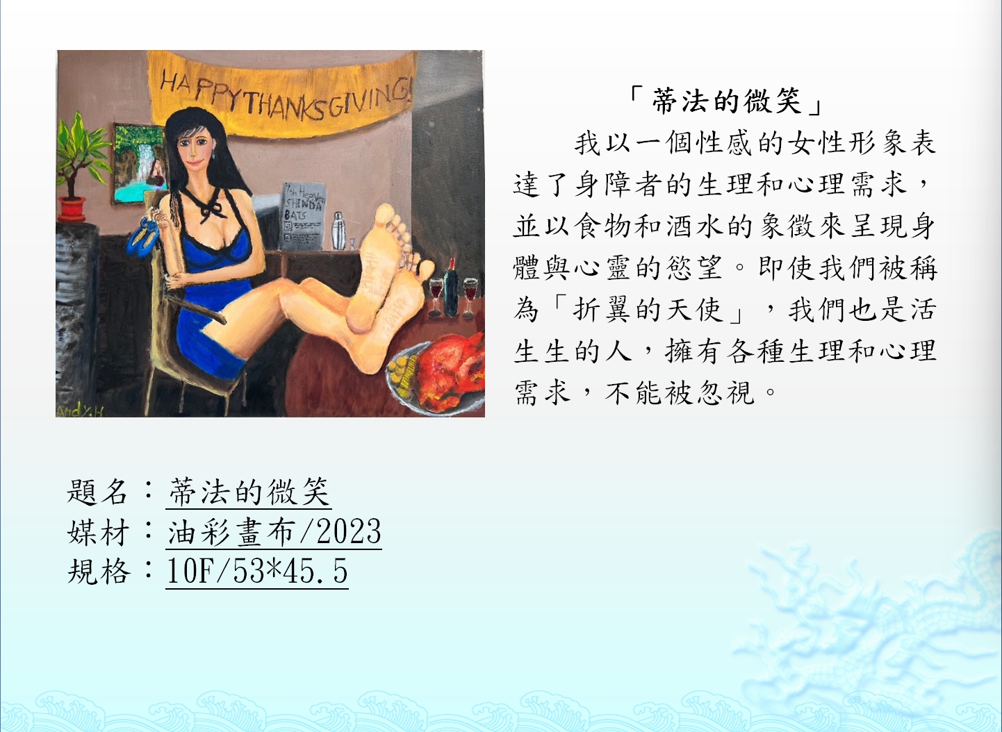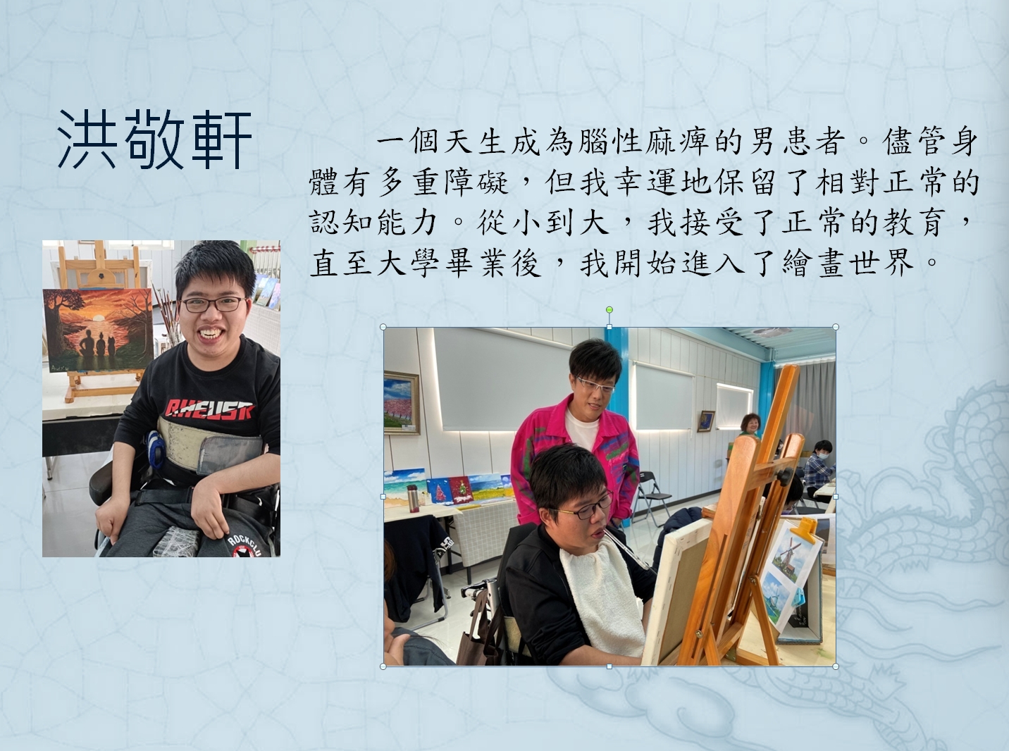 敬軒,一位從小就罹患腦性麻痺的愛笑大男孩。因為手腳僵硬、行動困難,我無法像一般人那樣拿起筆創作,但 我沒有放棄對畫畫的熱愛。我選擇用嘴巴咬住畫筆,慢慢學會用口足作畫。每一筆、每一劃,都是用意志畫出來的。 我最喜歡動漫畫風格,常常把角色靈感、幻想場景通通畫進油畫裡。畫畫對我來說不只是藝術,更像是在「創造我自己的遊戲宇宙」!雖然身體慢了點,但我的想像力跑得很快。 畫畫,讓我自由,也讓我開心。