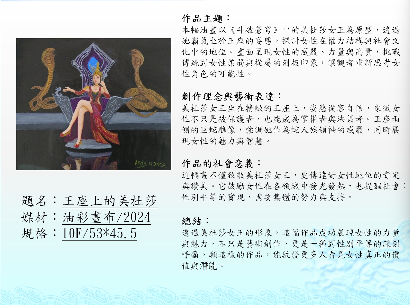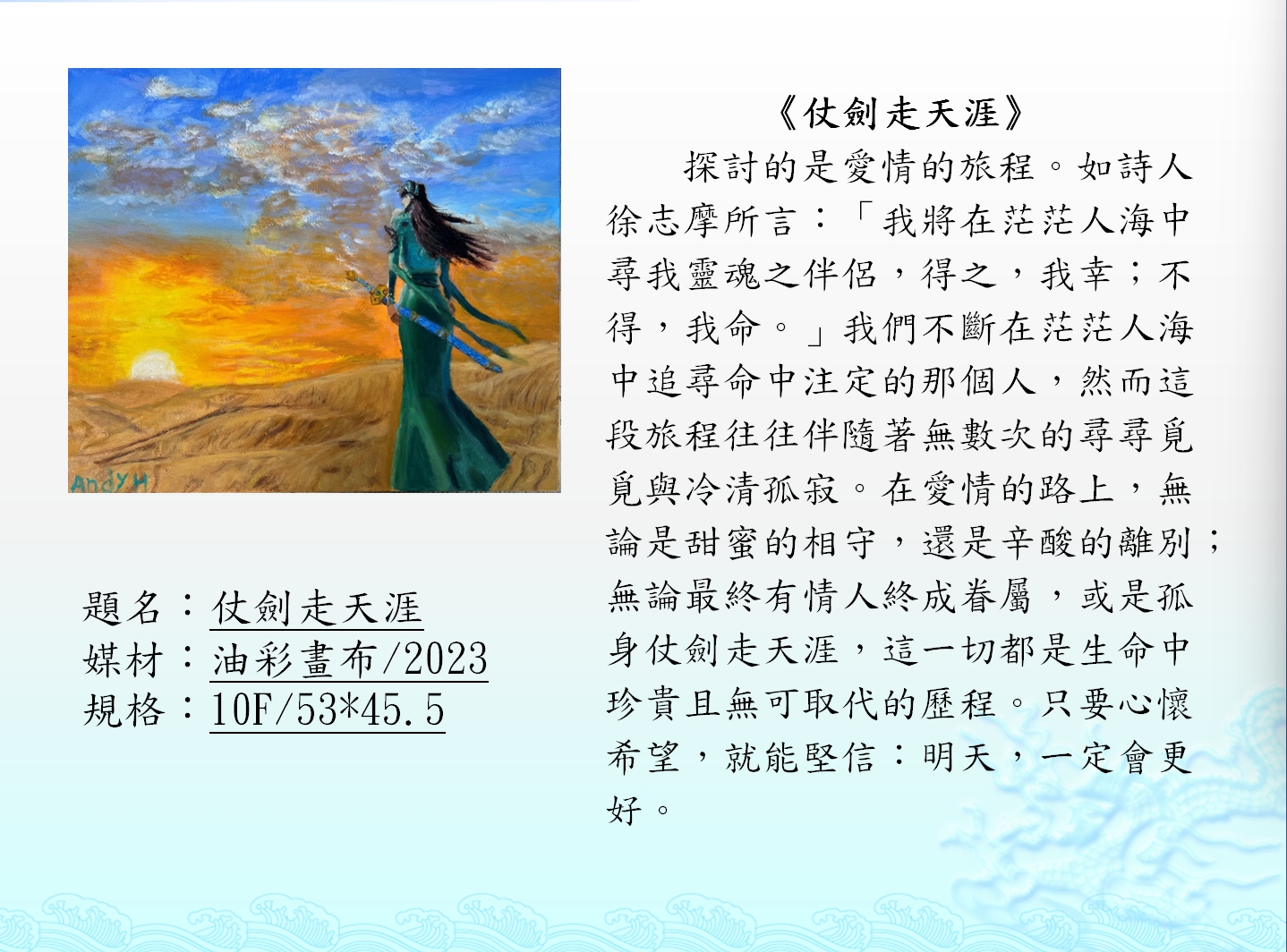 洪敬軒 CHING-HSUAN HUNG 作品欣賞日期:2025-03-31愛笑的大男孩,用畫筆開啟新世界,熱愛油畫、漫畫風,那他的創作就有一種獨特的魅力:用最困難的方式,畫出最快樂的世界。 |