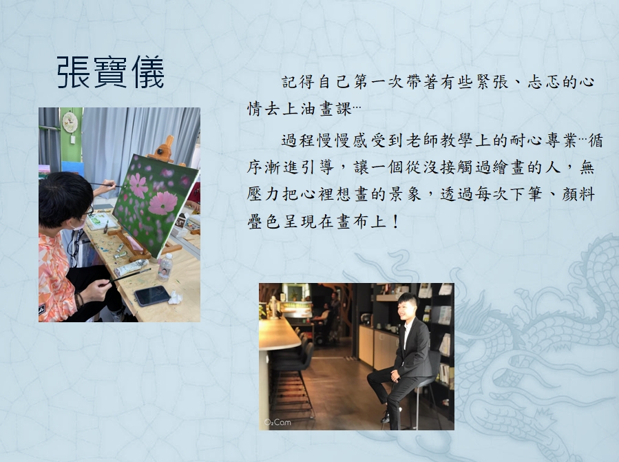 寶儀是一位靈光又超有想法的小藝術家。有邏輯、學習很快,但……有時也會突然忘記剛剛在幹嘛,畫到一半自己傻笑,她的創作就像她的個 性一樣:有想法、有節奏,但偶爾也會跳Tone一下,反而讓作品更有趣、更有驚喜。寶儀喜歡把觀察到的世界,用自己的方式重新整理、重新上 色,創造出屬於她的「寶儀式小宇宙」。