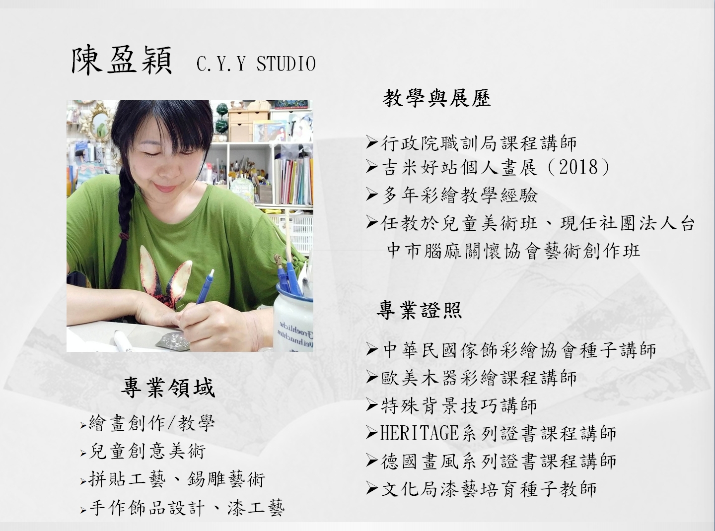 陳盈穎 開心彩繪藝術工作室 C.Y.Y STUDIO 老師日期:2025-04-04用溫柔的畫筆與耐心的教學,陪孩子走出生命色彩 |